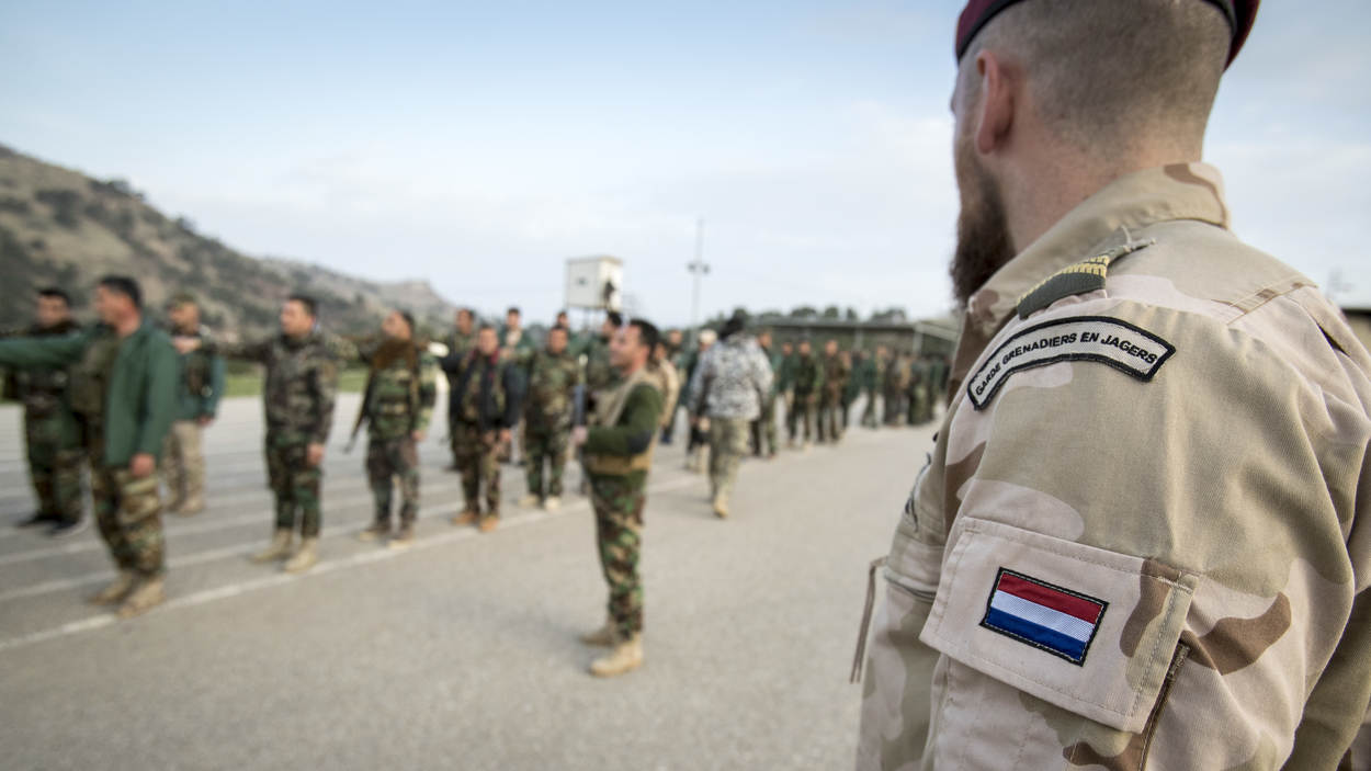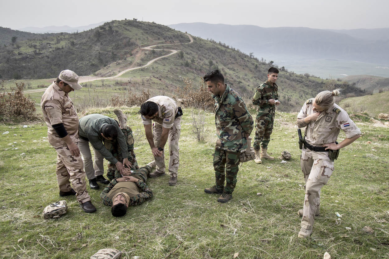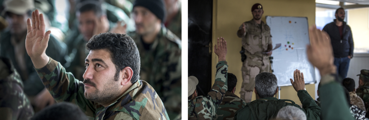 Stel, een gevangengenomen ISIS-strijder werkt niet mee. Wat dan? Diverse Peshmerga in het leslokaal steken hun hand op. Tweede luitenant Thom kijkt en kiest iemand. “Dan sla ik hem”, is het antwoord tijdens de opfrisles humanitair oorlogsrecht.