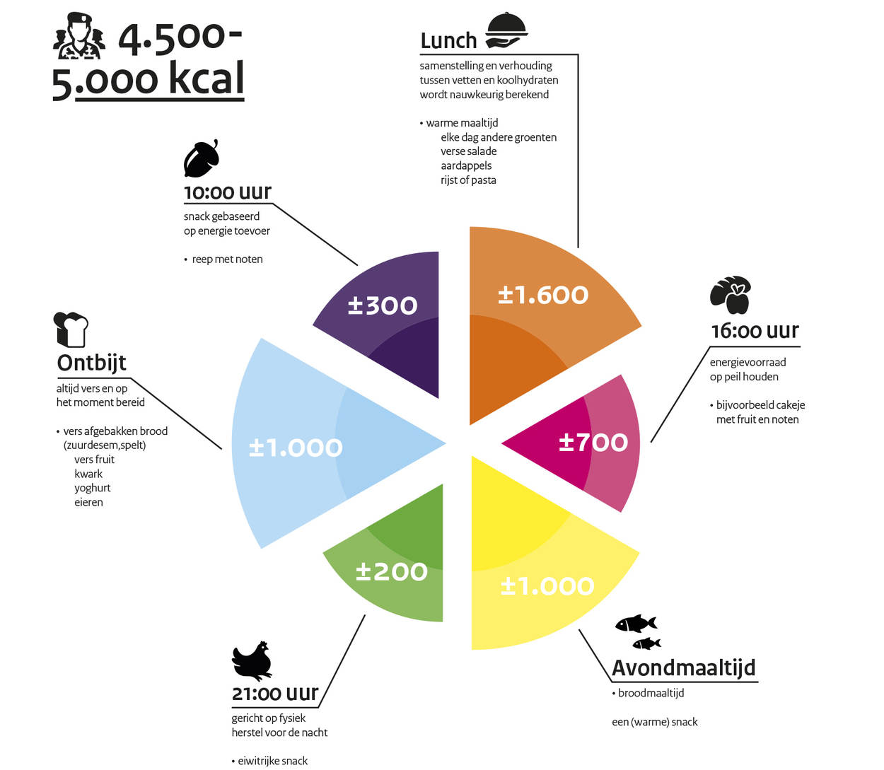 - Tussen 4.500 en 5.000 kilocalorieën verspreid over de dag. Van 3 naar 6 eetmomenten.