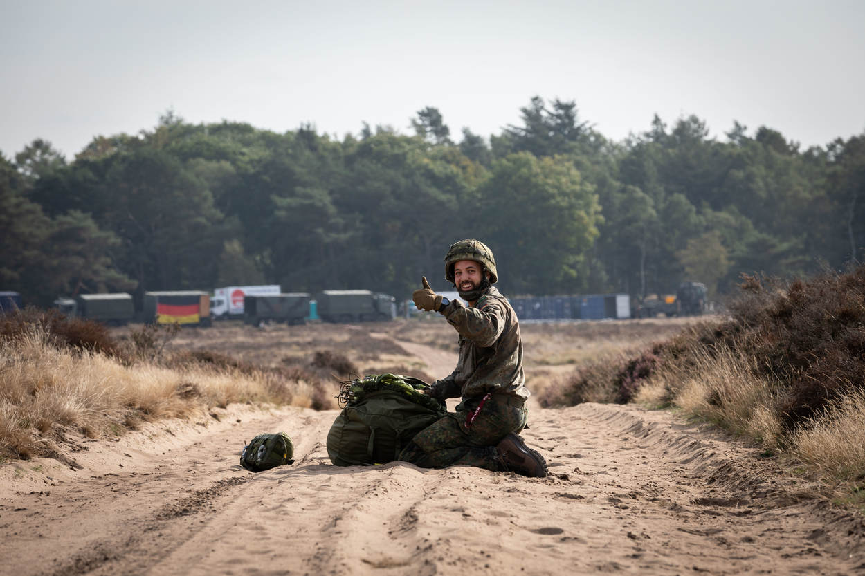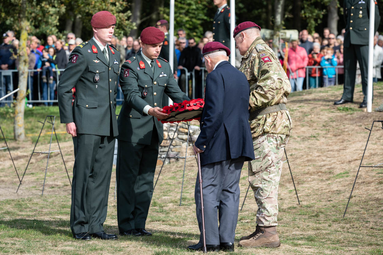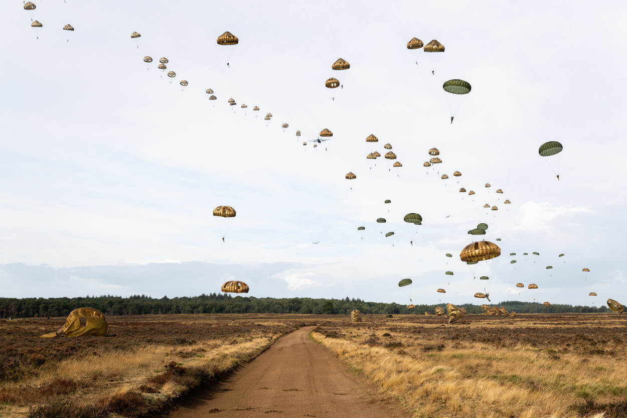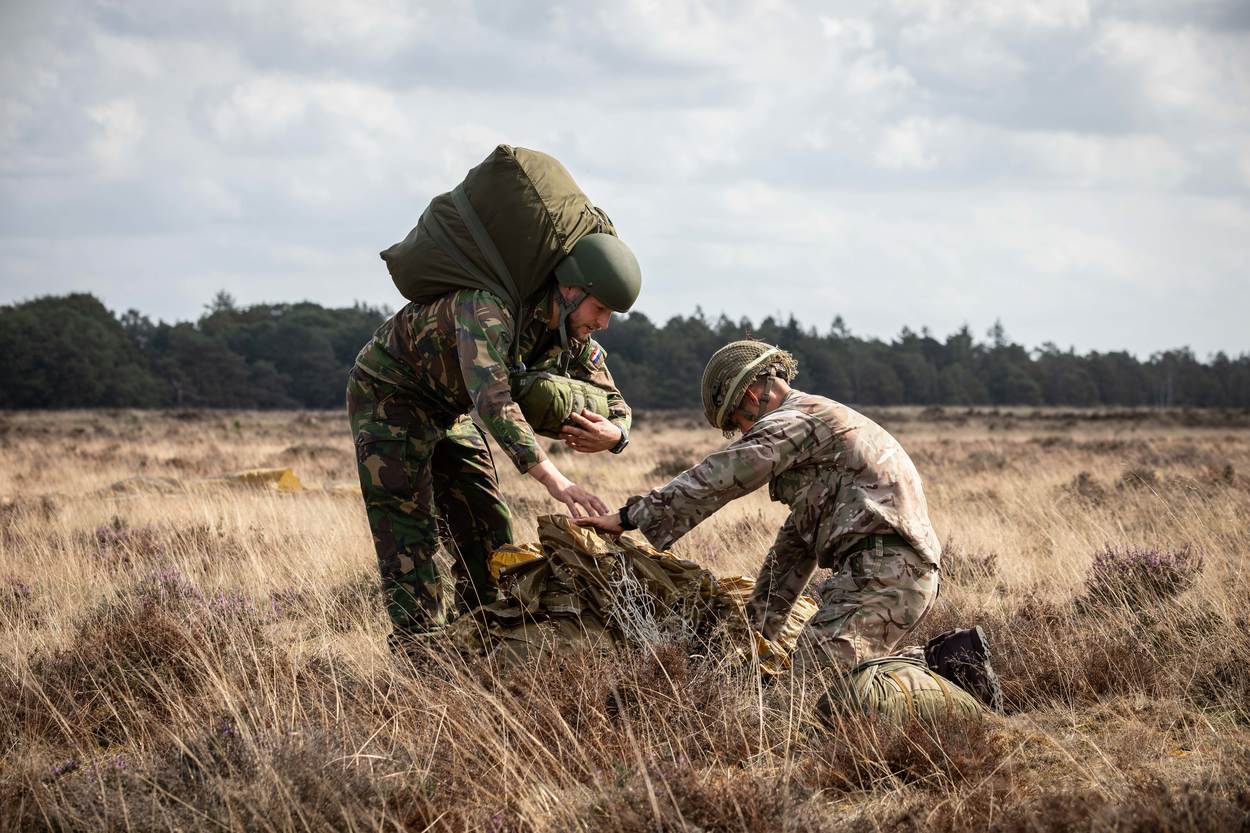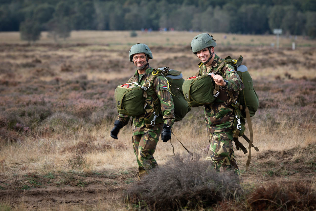 “Het pakket vliegt letterlijk boven ons hoofd. We staan op de mooiste locatie: midden op de dropzone. Wij maken de emoties mee van de jongens die springen, want we horen alles als ze naar beneden komen. Het is natuurlijk ook bijzonder dat de voormalige tegenstander nu aan onze zijde staat. Als die para’s uit verschillende landen met hun chutes op de rug over de Ginkelse Heide lopen, geeft ons dat een heel mooi gevoel.”