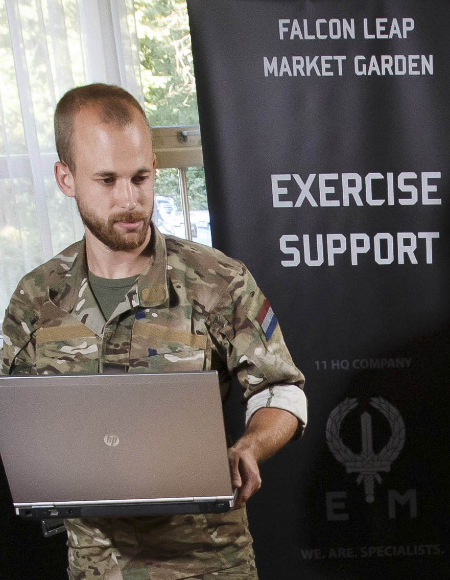 Edwin was vorig jaar 2IC van bovengenoemde compagnie, maar werkt nu bij het KCT. Waarom loopt hij zich dan voor Falcon Leap – immers een typisch evenement voor rode baretten – de longen uit het lijf? “Ik heb ooit EOS (essentieel registratiesysteem voor onder meer het opmaken van manifesten, red.) gebouwd. En als ik dan toch op de Harskamp ben, kruipt het bloed waar het niet gaan kan. Pak je toch weer extra dingen op waardoor je de nacht nodig hebt om je normale werk af te krijgen”, zegt hij met een stalen gezicht.