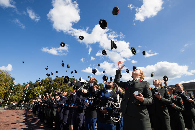 Met een flinke slinger gingen ze weer de lucht in. De petten van 155 geslaagde cadetten van de Koninklijke Militaire Academie in Breda. Ze ontvingen in september onder het toeziend oog van de commandanten van landmacht, luchtmacht en marechaussee, familie en vrienden hun officiersdiploma of bul.