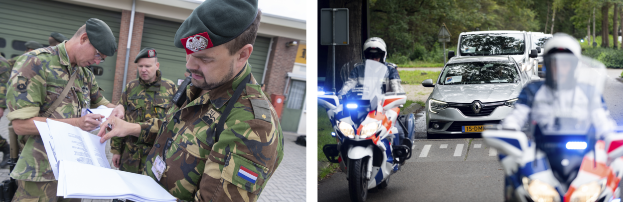 Onder KMar-begeleiding vertrekt het peloton inclusief al het materiaal vanuit Havelte (via Soesterberg) naar Leusden. “Ze moeten zo snel mogelijk ter plaatste zijn. Dus sirenes aan en met een kleine 150 kilometer per uur die kant op”, legt Veldman uit.