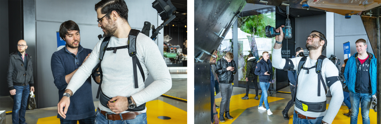 Sinds vorig jaar test Defensie flink met exo-skeletten: speciale militaire pakken die helpen om zwaar materieel makkelijker mee te dragen. Aan de bezoekers van Deflab de eer om het exo-vest uit te proberen. Zij kregen de ‘robotjas’ omgehangen en konden hem daarna meteen uittesten. “Een anti-sportschool”, merkt een bezoeker van Deflab lachend op. Met het pak aan draait hij zonder enige moeite een schroef boven zijn hoofd in.