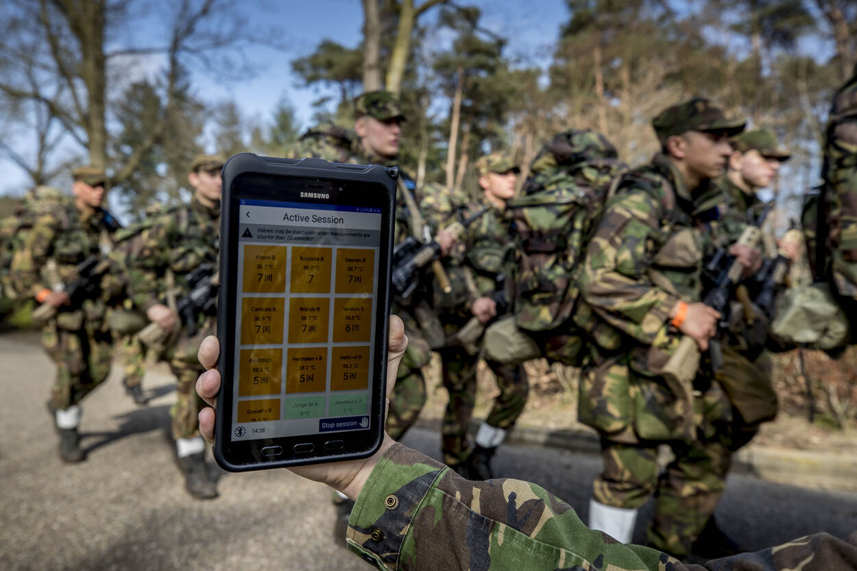 “De hittemonitor gebruikt een door het Amerikaanse leger ontwikkelde formule om lichaamstemperatuur te schatten uit de hartslagfrequentie”, vertelt onderzoeker Bertil Veenstra. “De groepscommandant krijgt een tablet. Als z’n mannen in zijn bluetooth-bereik lopen, ziet hij hun geschatte temperatuur en hun score op de ‘Physiological Strain Index’: een maat van 0 tot 10 die de warmtebelasting aangeeft. Als deze index te hoog is, wordt de groepscommandant gevraagd eveneens op andere symptomen van hitteletsel te letten. Al deze informatie samen helpt hem om normale vermoeidheid te onderscheiden van beginnend hitteletsel.”