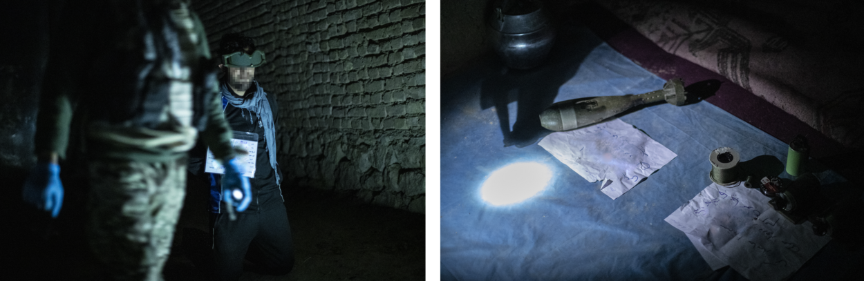 Een paar uur eerder in deze nacht verplaatste Triple 8 zich samen met de KCT’ers te voet naar dit object, de locatie waar hun verdachten verblijven. Na het arresteren van de ‘Taliban-strijders’ is het nu zaak zoveel mogelijk bewijs te verzamelen tegen de 3 verdachten. De Afghaanse politieman met het fototoestel kijkt nog eens kritisch naar zijn net genomen beeld. Hij zet een paar stappen naar achter en drukt opnieuw af. Tot tevredenheid van de Nederlandse adviseur. “Nu zie je dat de foto in dit huis genomen is.”