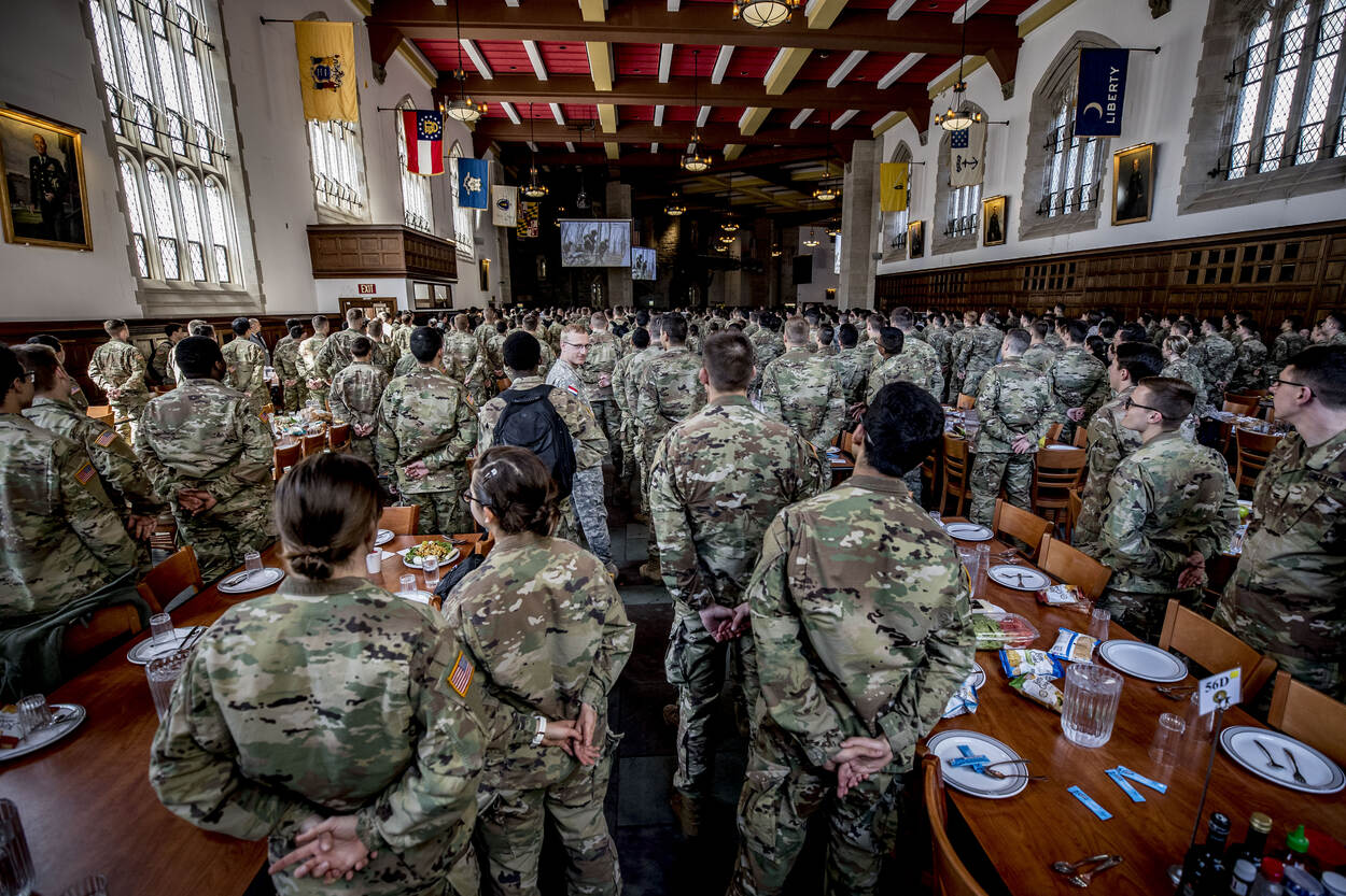 En ook tot de laatste snik ontbijten de 4.400 cadetten gezamenlijk, lunchen met z’n allen en dineren ze op donderdagavond samen. Dat gaat met militaire precisie. Alle officieren in spé verzamelen zich op gezette tijden op de binnenplaats en wandelen in formatie naar de grote eetzaal. Een cateraar werkt 24 uur per dag in 3 ploegendiensten om alle monden te voeden. “Wat een rust als ik volgende maand alleen met m’n ouders aan tafel zit”, vertelt Jansen, die met z’n hoofd al een beetje in Nederland is.