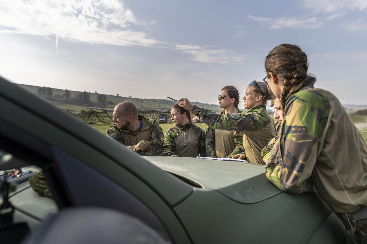 Voor chauffeur/verzorger soldaat-1 Nadieh – pas op haar eerste functie – is alles nieuw. “Ik vind het heel bijzonder om te zien hoe de Engelsen werken”, vertelt ze onder de camonetten achter haar Zau. “We hebben eergisteren een bevelsuitgifte van ze gehad. Wij spreken hun taal en passen ons aan, maar we delen ook veel hoor.” Onbewust benadrukt ze haar laatste opmerking meteen, door haar spork in een opgewarmde Britse lunch te steken.