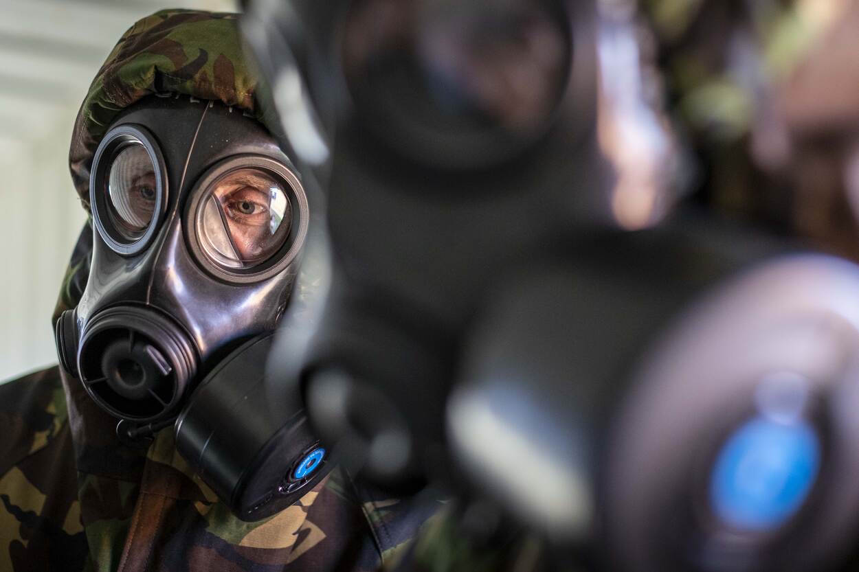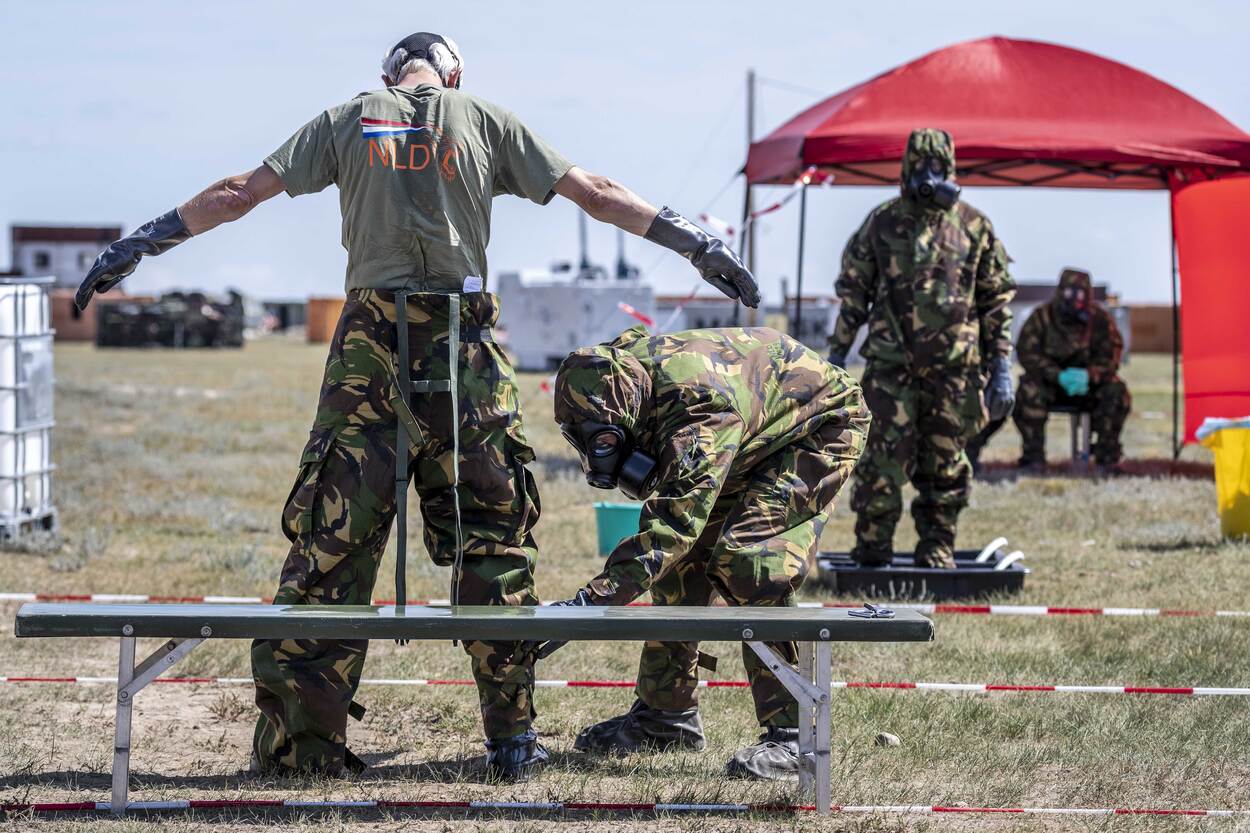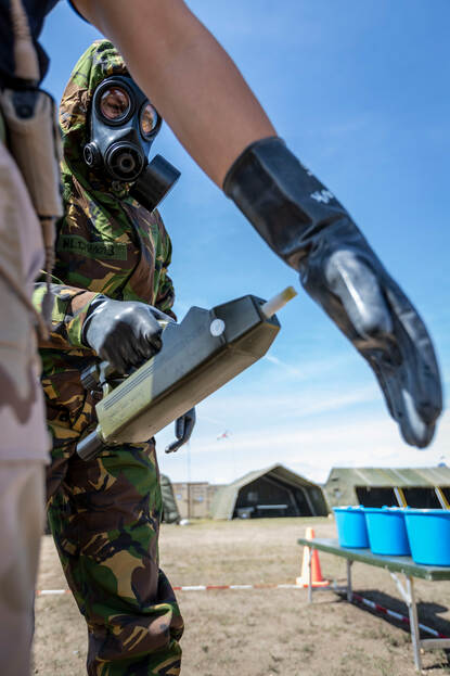 Dit is een jaarlijkse oefening met echte CBRN-strijdmiddelen, opgezet door de NAVO. In totaal trainen hier 13 landen. Dat is aan de ene kant voor de eenheden zelf, om vertrouwen te krijgen in het materiaal en elkaar. Trainen met echte stoffen doet iets met je. Vergelijk het met een schietoefening. Als je met scherp schiet, sta je ook anders op de schietbaan. Aan de andere kant is deze oefening er om bij andere NAVO-landen ‘in de CBRN-keuken’ te kijken.
