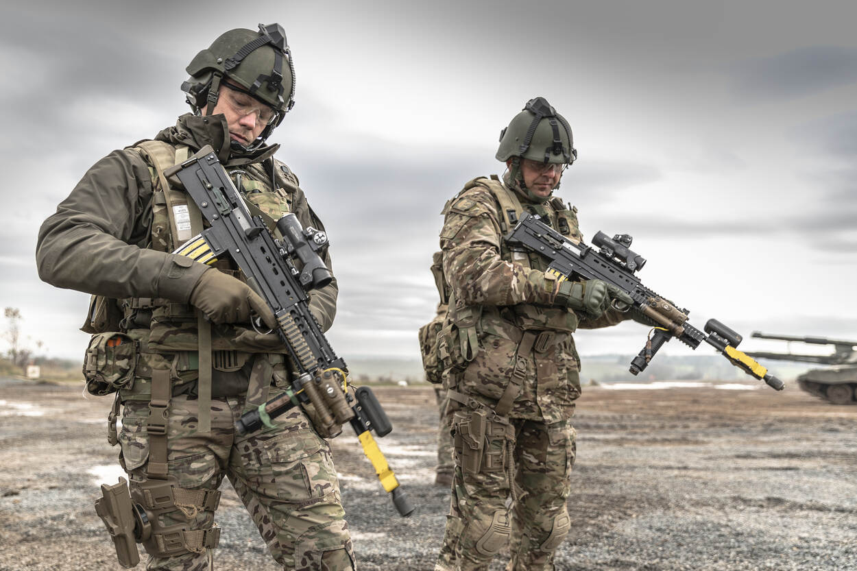 Onder een waterig zonnetje evalueert de groep de actie. “Jullie plan was goed”, stelt de instructeur. “Er zijn verbeterpunten, maar tijdens een oefening mag je fouten maken. Daar leer je van, zodat je ze in missiegebied niet maakt.” De 2 Nederlandse deelnemers knikken. Omgehangen met een Brits wapen en scherfvest gaan Niels en Ronald perfect op in de eenheid. “De SA80 is wel een stuk zwaarder dan onze Colt”, merkt Niels later op over het geweer dat bij de Britse uitrusting hoort. “We hebben veelvuldig in het veld geoefend, toch moet ik er nog steeds aan wennen. De magazijnen zitten achterin in plaats van voorin zoals bij de meeste wapens. Maar je kunt er heel nauwkeurig mee schieten en dat is het belangrijkste.” Niet voor niets werken de internationale deelnemers met Brits materieel. “We willen alleen cursisten die volledig geïntegreerd zijn”, vertelt warrant officer Dale Bennison. “Het belangrijkste is dat ze de taal goed spreken, want onze cursus mag niet lijden onder slecht Engels.”