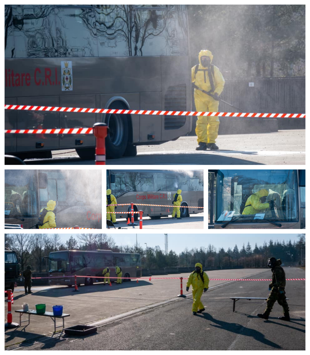 Het Rode Kruis had om deze hulp gevraagd. Op een speciaal hiervoor ingericht ontsmettingspunt in Soesterberg reinigden de CBRN-ers de bus aan de binnen- en buitenkant. Gehuld in beschermende kleding en maskers behandelden zij het voertuig met ontsmettende vloeistoffen zodat het weer terug kon naar Italië.