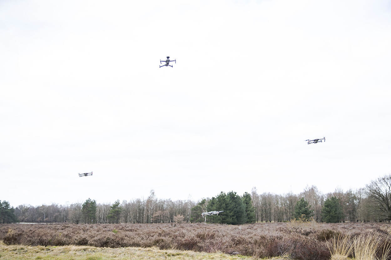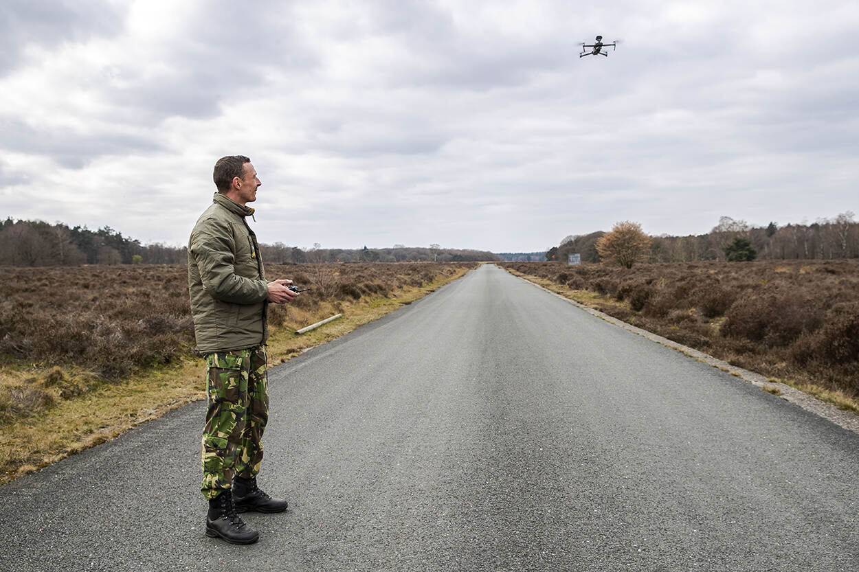 “Houd alstublieft 1,5 meter afstand”, klinkt het afgelopen donderdag uit de lucht. Boven de Amersfoortse Vlasakkers zoemt een drone met een dusdanig goede luidspreker dat negeren onmogelijk is. Het scenario is onderdeel van de meest uitgebreide testdag die de eenheid Robotica en Autonome Systemen (RAS) van 13 Lichte Brigade ooit opzette. 9 drones moeten 8 uur lang in de lucht blijven en 9 livestreams afleveren. Zo zouden de onbemande vliegende objecten hulpverleningsdiensten in staat kunnen stellen grote groepen mensen in de gaten te houden én te waarschuwen.