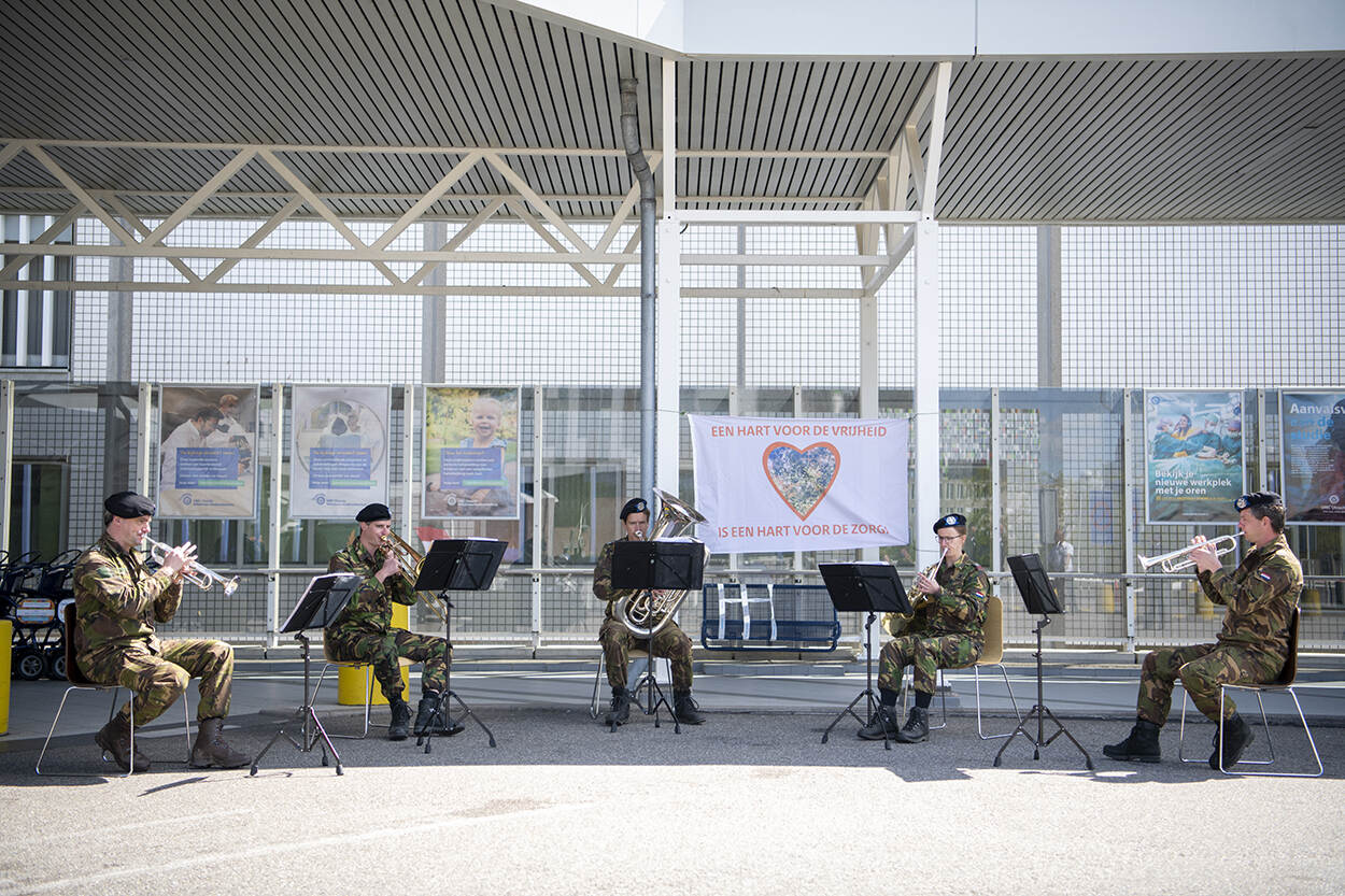 Militaire muziek op 1,5 meter afstand bij het UMC Utrecht. (Foto: KPL1 Shane Winsser)