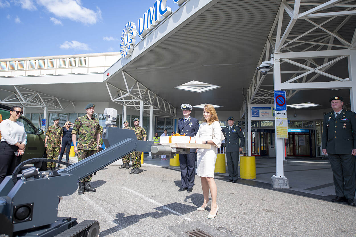 Brigadegeneraal Dubbeldam leverde namens het Operationeel Ondersteuningscommando Land (OOCL) geheel corona-proof gebak af bij de ingang van het UMC Utrecht. (Foto: KPL1 Shane Winsser)