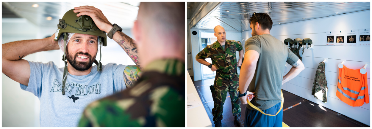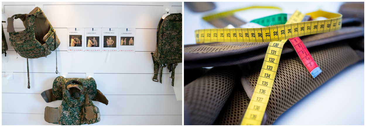 “Zo komt onder het scherfvest een steunband die op de heupbotten precies goed moet zitten.” Het oude vest rustte alleen op de schouders. “Deze is dus veel comfortabeler, maar als het niet goed zit, kun je blessures op lopen.”