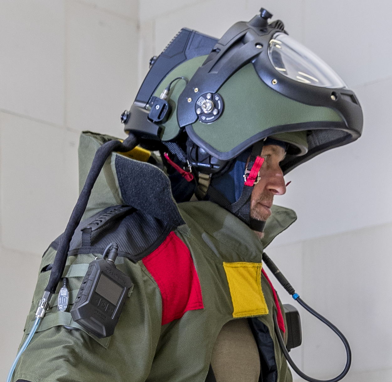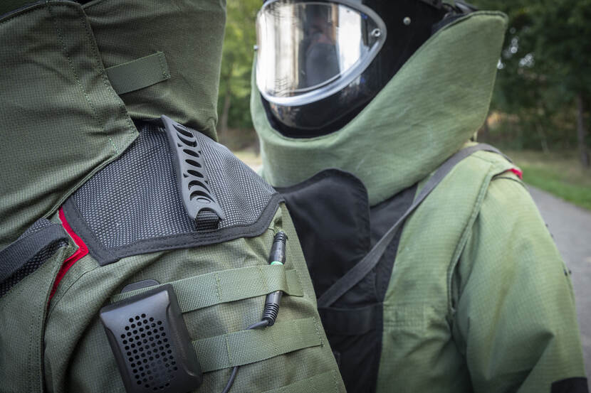 Het paradepaardje van bompak nr. 10 is voice control. “Alsof je van een Nokia 3310 naar een iPhone X gaat”, benadrukt EOD’er sergeant-majoor Maarten. ‘Licht aan’, ‘licht rood’, ‘ventilatie uit’: het zijn zomaar een paar commando’s die het pak laten werken. “Handmatige bediening is prima, behalve als je je handen vol hebt. En laten wij nu vooral met onze handen werken.”