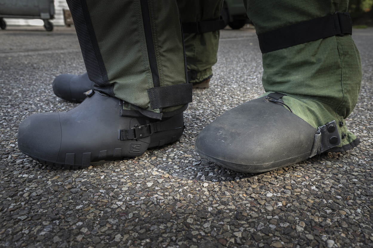 ‘One size fits all’. Of je nu maat 39 of 46 hebt, iedereen past de nieuwe schoenen die uit 2 delen bestaan en naar elkaar toegetrokken worden met een snelsluitsysteem. En waar de EOD’ers voorheen schoeisel droegen met alleen protectie in de neus en bovenkant, beschermen de nieuwe exemplaren de hele voet. Wel zo’n geruststellend idee. “En ze lopen beter dan die oude flapschoenen”, reageert Maarten.