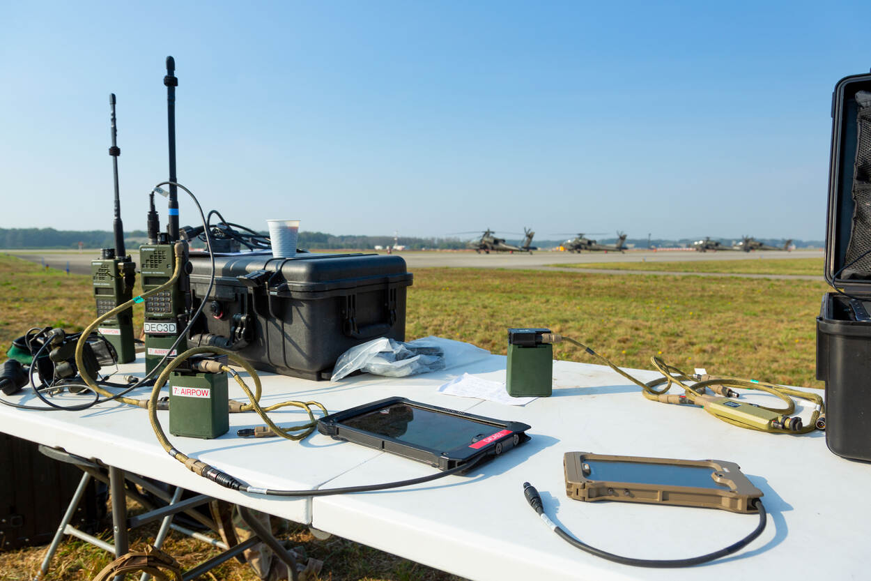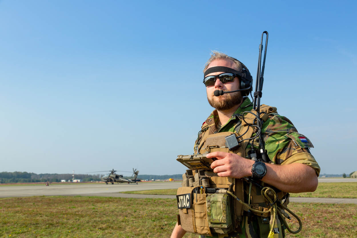 Een COVID-proof opstelling om het uitwisselen van databerichten en het streamen van video te testen was daarom midden september opgebouwd op Vliegbasis Gilze-Rijen. Aan de ene kant een vlieger in een Apache, aan de andere de JAGG met personeel van TNO en de hardware- en softwarefabrikanten van de DACAS-kit uit Nederland en de USA. Het geheel uiteraard ondersteund door de landmachters van Team DACAS en CD&E en een aantal JTAC’s die proberen de verbinding te leggen met de gevechtshelikopter. Van Driel: “Via het defensiematerieelproject (DMP) ‘Joint Fires’ zijn 55 DACAS-kits aangeschaft. Dat is voldoende voor de operationele inzet, maar nog niet voor opleiding en training op bijvoorbeeld Vlieland.”