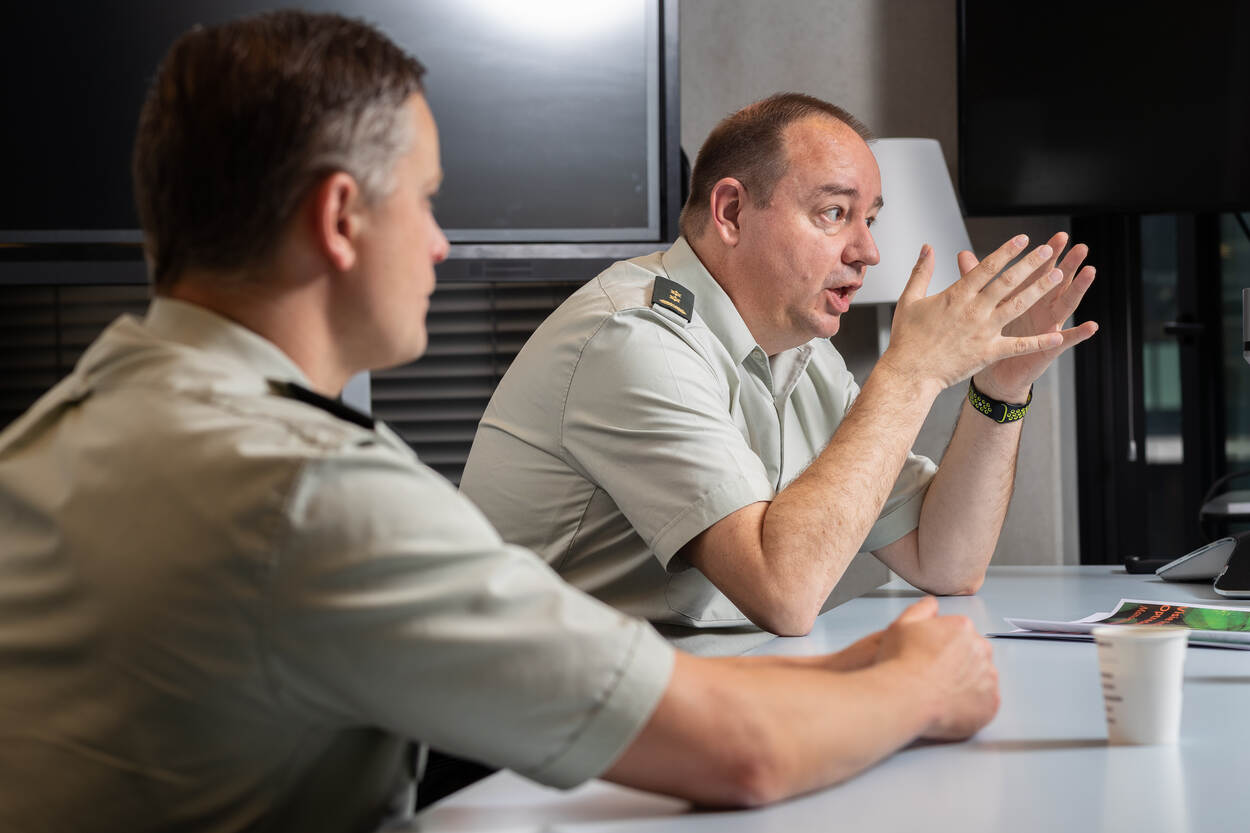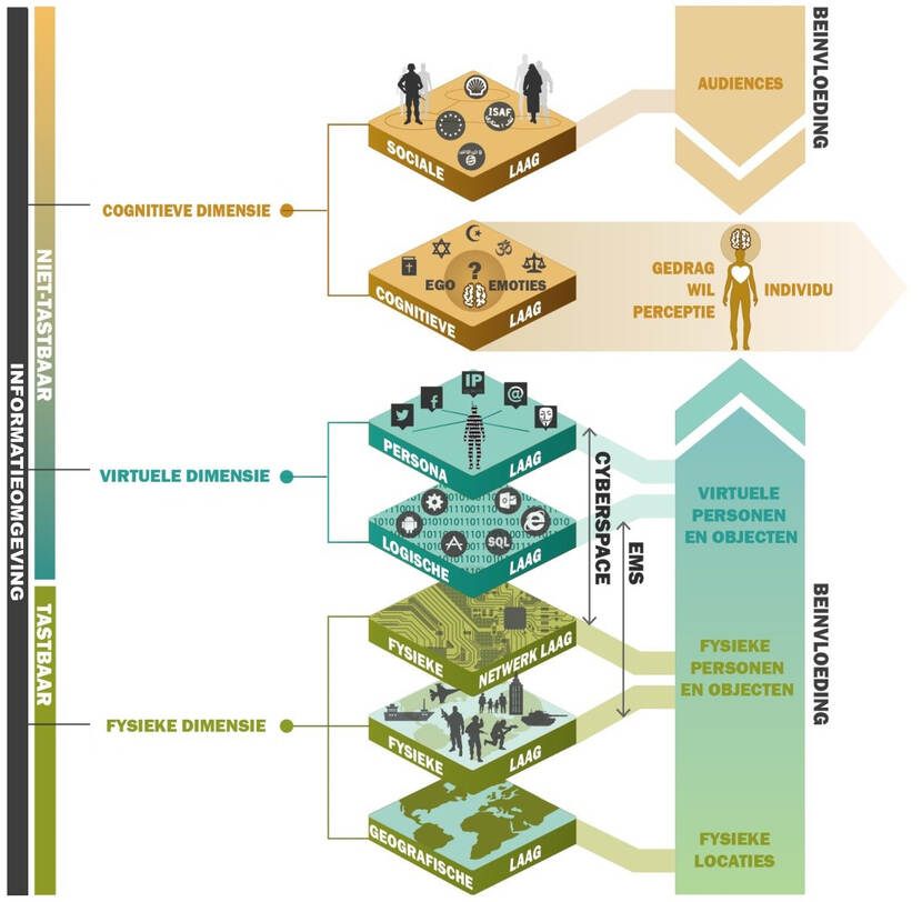 Overste Smit: “We zijn over het algemeen goed in staat om te opereren in de fysieke dimensie. Dat zijn we gewend, zo worden we opgeleid. Bij die andere 2 dimensies merken we dat onze potentiële tegenstanders zich hier razendsnel in ontwikkelen en wij achterblijven. Juist daar moeten we ons verder ontwikkelen zodat we ook via die dimensies onze militaire doelstellingen kunnen bereiken. De reflex is dan al snel: spullen kopen. Maar die zijn maar voor een klein deel de oplossing van het probleem. Ook je kennis, kunde, vaardigheden en concepten moeten meegroeien.”