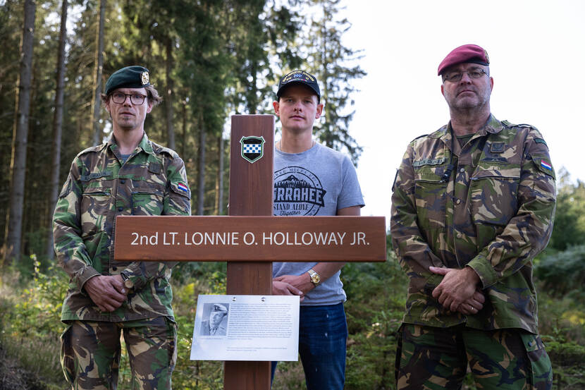 Een groepje militairen van 13 Infanteriebataljon Regiment Stoottroepen Prins Bernhard loopt door het Belgische Dreiherrenwald, pal op de grens met Duitsland. Ze torsen een houten kruis met betonnen voet met zich mee. Op de dwarsbalk staat ‘2nd lieutenant Lonnie O. Holloway jr.’. Het logo van de 99th Infantry Division en een kunststofplaat met een foto en een levensbeschrijving geven meer duidelijkheid. Op een voor een buitenstaander willekeurige plek graven de militairen het monument in.