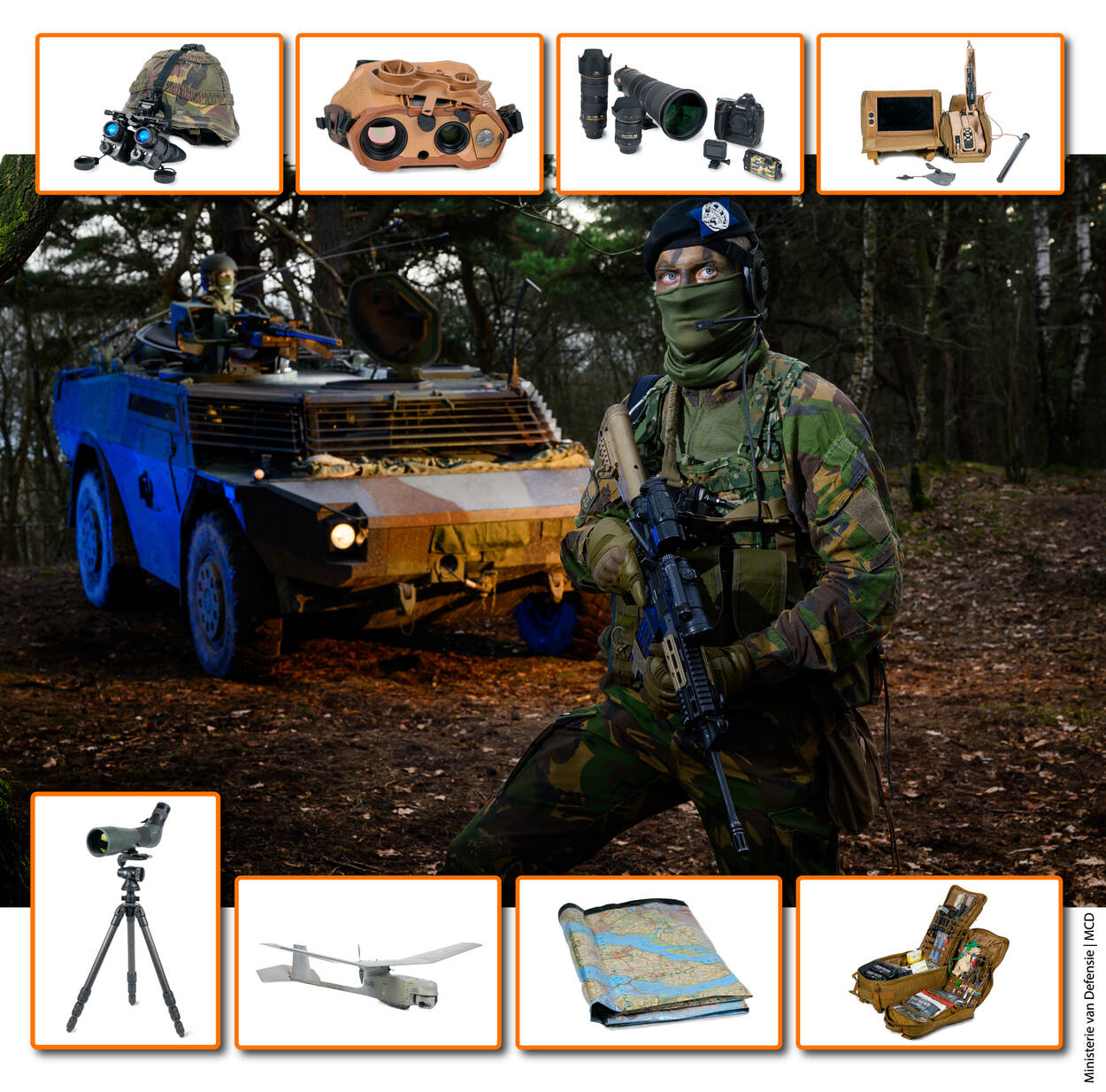 Slimme afko voor foto-, audio-, videoset. Bestaat uit een serie apparaten waar zelfs een paparazzifotograaf warm van wordt. Met behulp van een GoPro, compactcamera en spiegelreflexcamera legt de verkenner – eventueel op grote afstand – voor het hogere dek relevante informatie vast. Dat kan van alles zijn, van verdachte personen tot details van te nemen gebouwen. De telelens van de spiegelreflex heeft een enorm zoomvermogen en stelt op 600 meter nog lachend scherp op de kentekenplaat van een vijandelijk voertuig.