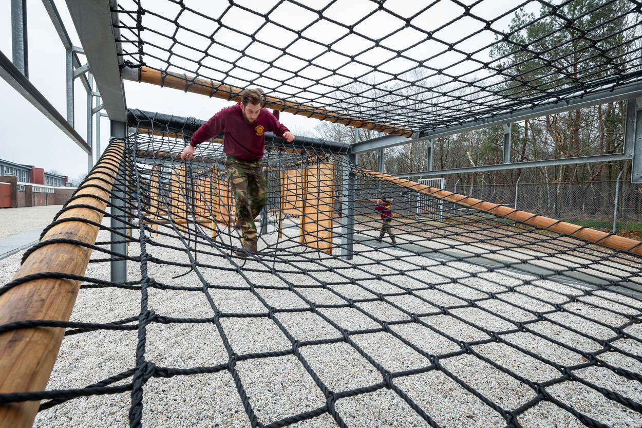 “Het dus heel iets anders dan de traditionele hiba”, zegt sportinstructeur adjudant Niek van Gils. “Geen vervanger maar een aanvulling. En is een hindernis kapot of wil de LO&Sportorganisatie wat anders, is de baan makkelijk aan te passen. Je knoopt of klikt een touw los en hangt wat anders aan de balk.”