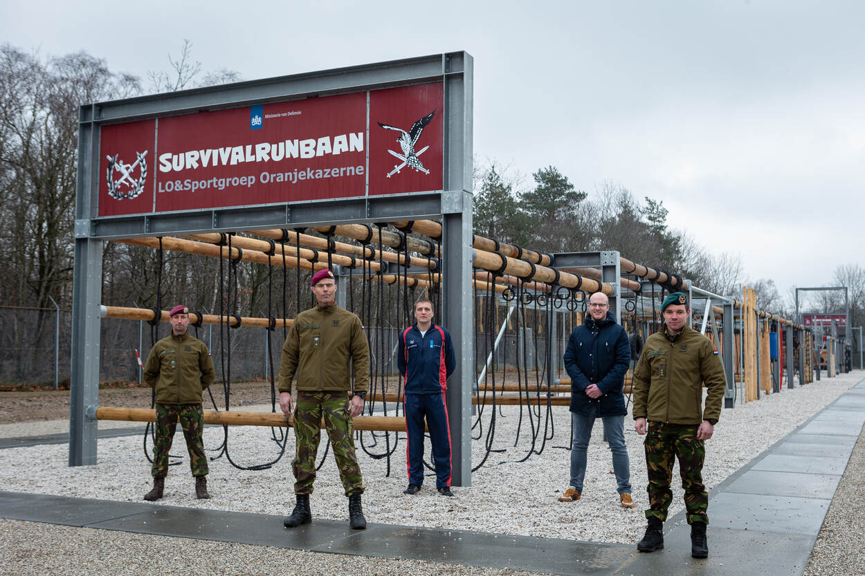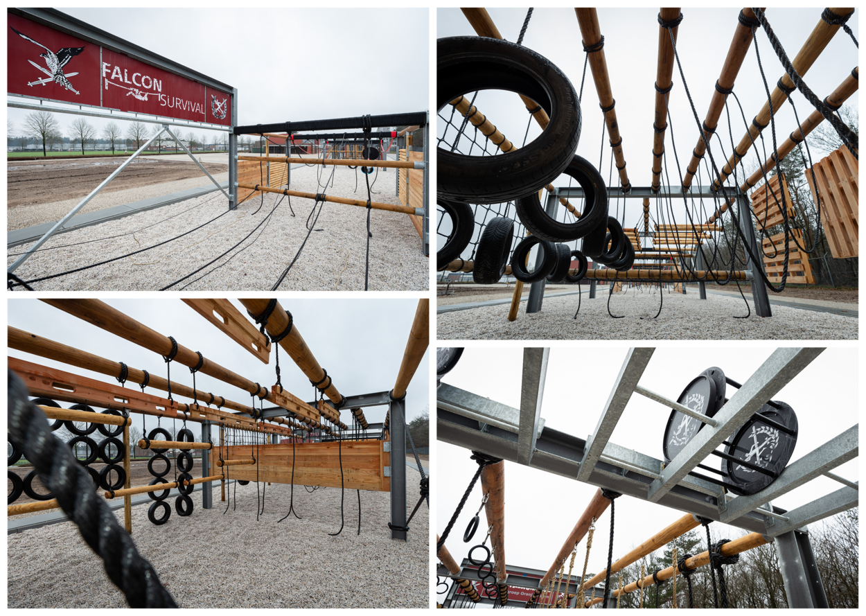 Rijd je de Oranjekazerne in Schaarsbergen op, kun je niet om de nieuwste aanwinst voor 11 Luchtmobiele Brigade heen. Naast de hoofdpoort is een innovatieve survivalrunbaan gerealiseerd. Door de geringe hoogte van 3 meter en de valveilige onderlaag van ‘zacht’ grind mag hij zonder begeleiding gebruikt worden. Natuurlijk is hij ook geschikt voor groepen onder begeleiding van een sportinstructeur.