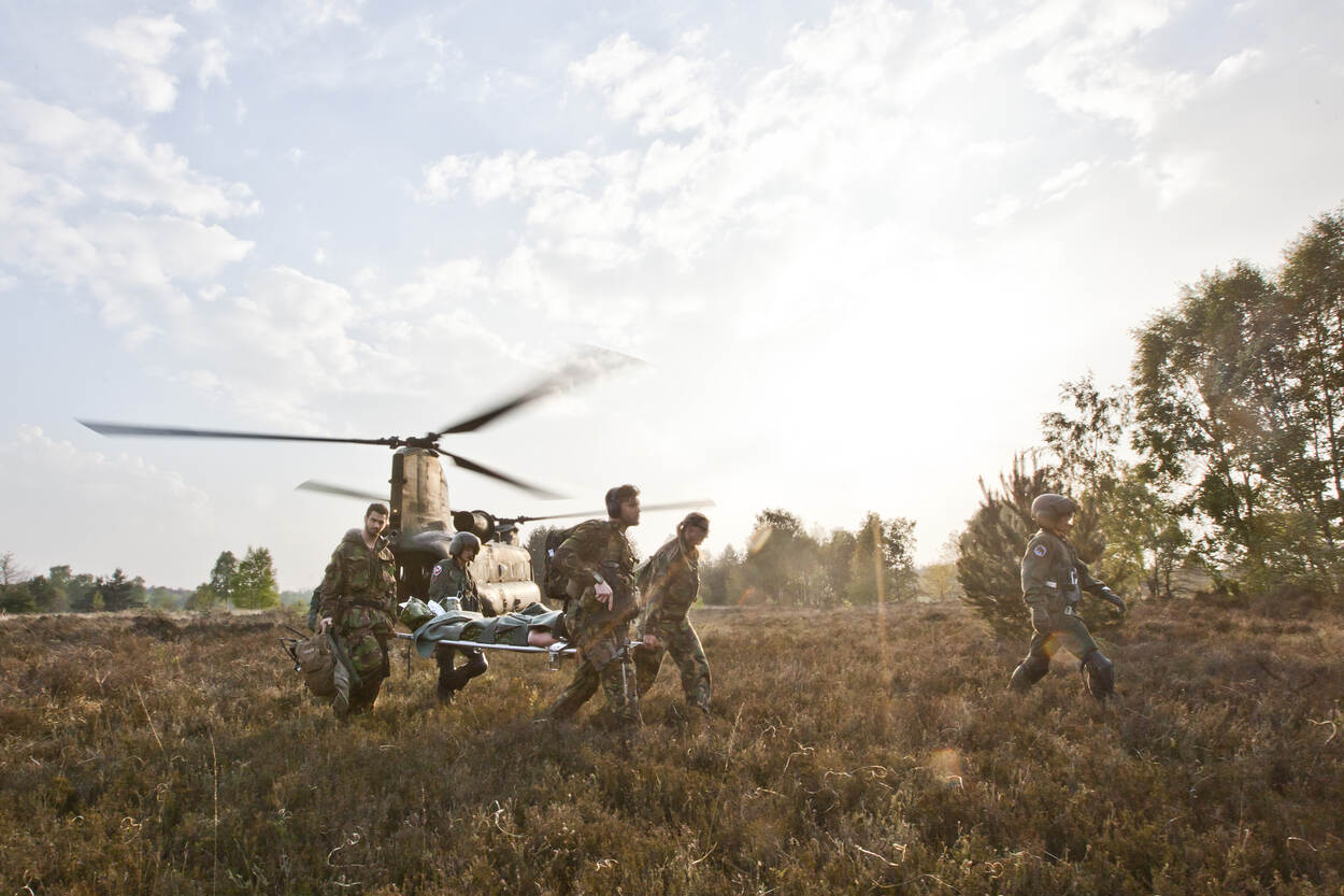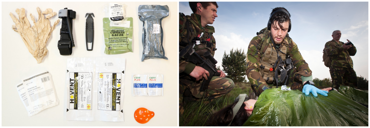 Militairen krijgen bij operationele inzet een ZHKH-uitrusting verstrekt. De tassen kunnen qua uiterlijk verschillen, maar de inhoud is hetzelfde en bestaat onder meer uit een tourniquet, wonddrukverband en gecomprimeerde gazen. Rechts: tijdens oefeningen is er vaak aandacht voor hoe om te gaan met slachtoffers, al dan niet tijdens het gevecht.