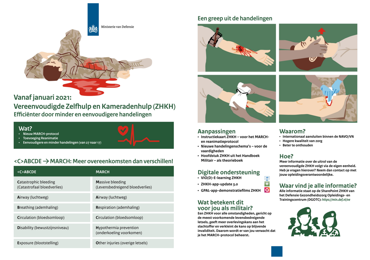 De belangrijkste aanpassing is de overstap naar een nieuw protocol, gestoeld op de Amerikaanse Tactical Combat Casualty Care (TCCC). C-ABCDE maakt plaats voor MARCH, dat internationaal beter aansluit. MARCH staat voor Massive bleeding, Airway, Respiration, Circulation en Hypothermia. Het nieuwe protocol is eenvoudiger en bevat minder handelingen: 17 in plaats van 27. Monitoren van het bewustzijn is volgens Jager de rode draad. Daarnaast komt reanimatie erbij. “We richten ons dus niet alleen op operationele situaties, deze ZHKH kunnen we toepassen onder alle omstandigheden”, aldus de docent verpleegkunde.