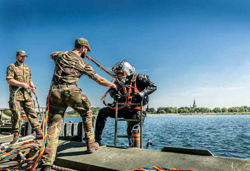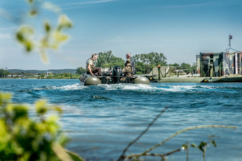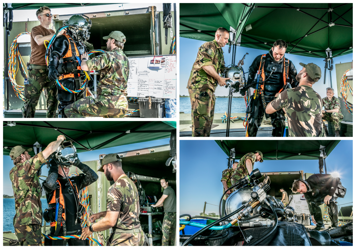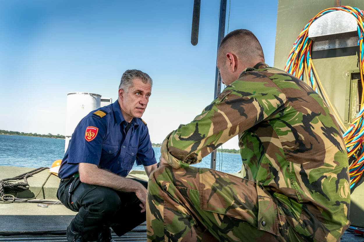 5 pontons van een vouwbrug vormen op deze zonnige dag in een relatief rustig deel van de plas het platform voor de duikers. Ondanks een waarschuwingsteken op een van de containers dat zich duikers onder het wateroppervlak bevinden, komt de pleziervaart regelmatig een kijkje nemen. Een jolig viertal (“wij hebben ook in dienst gezeten bij de landmacht”) op een zeilboot maakt zich snel uit de voeten als sergeant-1 Maik ze vriendelijk vraagt hun uitbundigheid elders te uiten. “Je kunt het ze niet echt kwalijk nemen”, zegt hij. “Voor zulke bootjes heb je nu eenmaal geen vaarbewijs nodig en men kent blijkbaar de borden niet.”