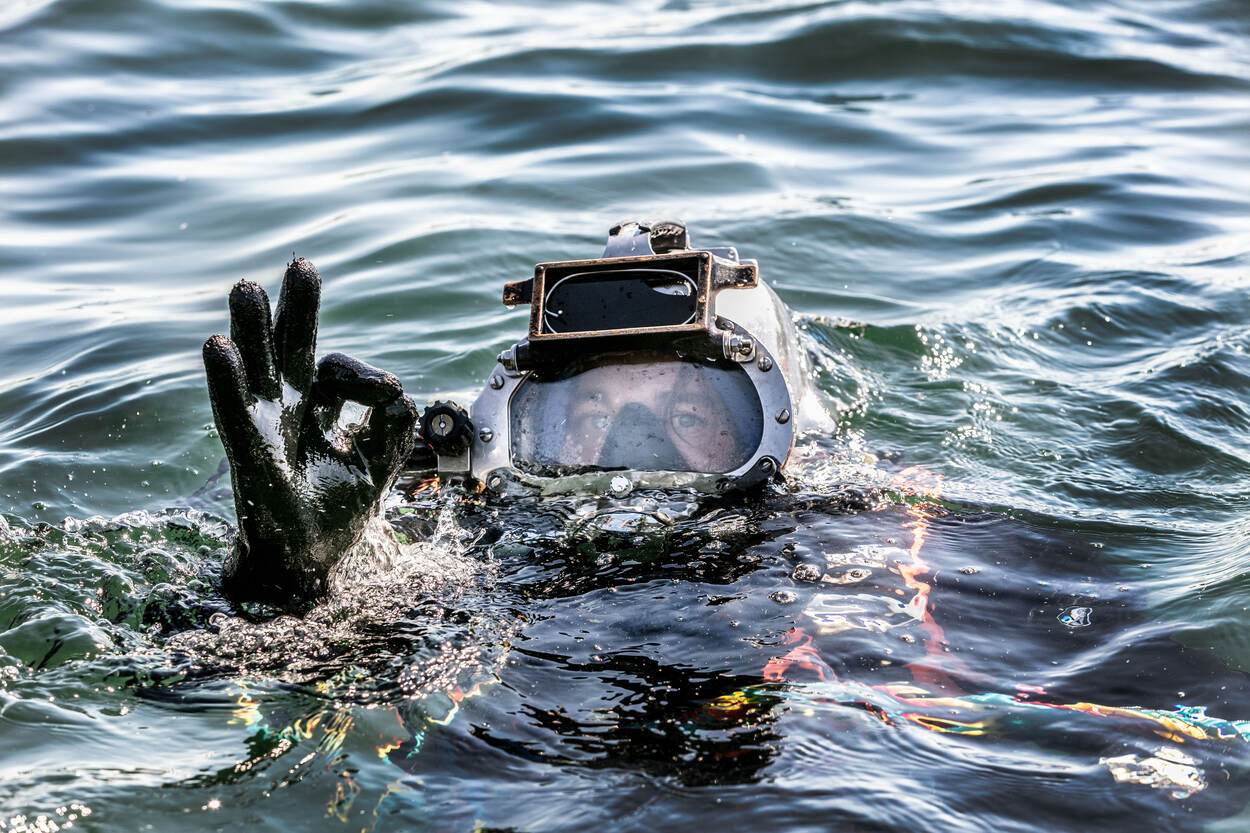 Korporaal Kevin staat nog uit te druipen van een uurtje hard werken en zegt gelijk wat iedere duiker direct opmerkt: “Het water is hier werkelijk belachelijk helder. Dat maakt het lassen en schuren wel een stuk gemakkelijker”, bekent hij, met onderwaterfakkels nog in de hand. En wat hebben hij en zijn ‘bud' gedaan? “Het luik opgemeten voor de doorgang naar de boot. Vervolgens checken we ook nog wat er op het wrak staat en meten we verschillende platen op”, vertelt hij, terwijl het volgende duo zich alweer klaarmaakt om in vol ornaat te water te gaan.