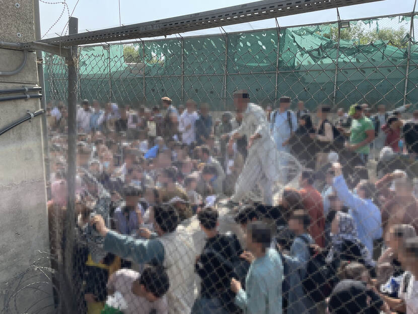 De opdracht is even helder als summier: haal de mensen op de lijst van Buitenlandse Zaken uit het gebied. Maar hoe? “Na de landing op Kabul zakte de klep van de C-130 Hercules en al wat we zagen was chaos.” Verlaten gebouwen en om de luchthaven ‘knetterveel mensen’. Allemaal willen zij de luchthaven bereiken. Amerikaanse militairen zijn echter verantwoordelijk voor de base. Iedereen toelaten tot de luchthaven is simpelweg niet mogelijk, want een wanorde op de landingsbaan zal het gevolg zijn. Om zijn woorden kracht bij te zetten, toont Tijs een luchtfoto. De zwarte vlekken bij de gates zijn in werkelijkheid mensenmassa’s, verzameld voor de poorten. “Ik dacht: als we hier even honderden mensen uit moeten trekken gaat dat nooit lukken.”