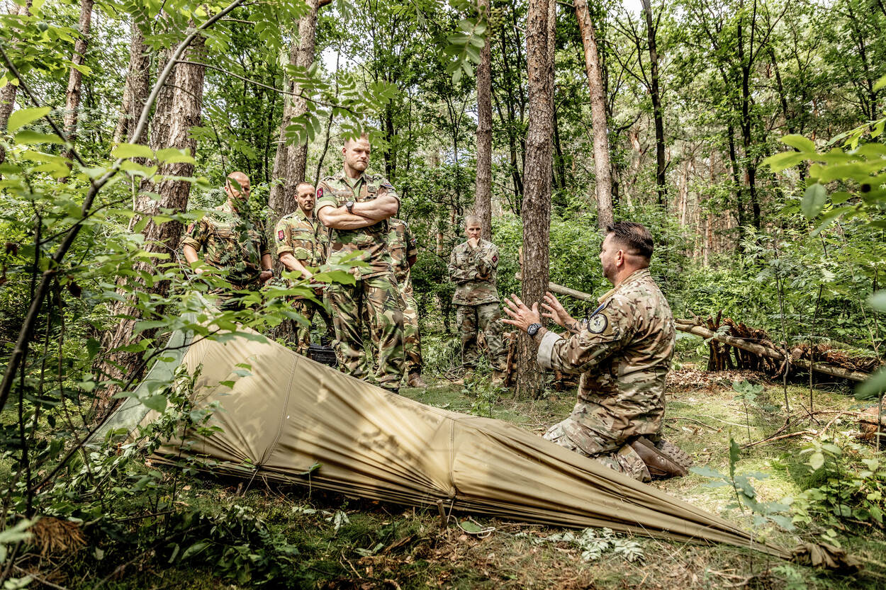 Dus volgen de komende tijd 1.861 functionarissen met een rode baret de opleiding op B-niveau. Eerst theorie en daarna een paar dagen bikkelen in het bos. De pilot heeft tot doel om het lesprogramma te optimaliseren en aan te laten sluiten op het aanvangsniveau van de parate luchtmobiele militair. Ravenhorst: “Op voorhand maken we een inschatting van wat dat basisniveau is. Zo is al gebleken dat er meer aandacht moet zijn voor kaart en kompas. Cursisten moesten contact maken met eigen troepen en binnen in een straal van honderd meter van hen komen. Nu kwamen ze moederziel alleen aan op afstanden van vijfhonderd meter van elkaar. Dat is niet goed genoeg en zullen we in de volgende opleiding ‘repareren’.”