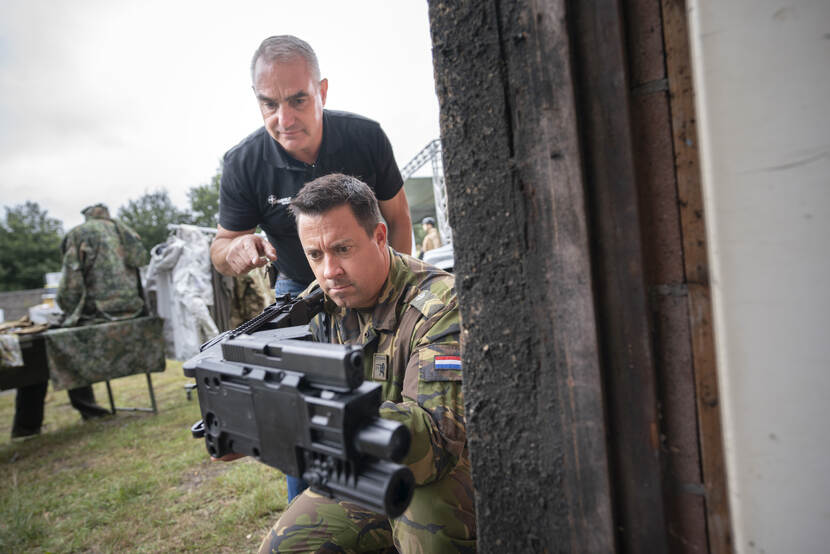 Sergeant-1 Joris (OTCMAN) staat ondertussen met de Corner Shot, een vinding van de Israëlische kolonel Amos Golan, in handen. Oud-commando Henk Moerland, eigenaar van Profile Equipment, is de instructeur. “Dat is wel even wennen, het is net of je van afstand tv zit te kijken”, reageert Joris, als hij met een camera om de hoek kijkt en ook daadwerkelijk kan vuren. “Maar dit is wel een wapen dat je bij OVG kunt gebruiken.”