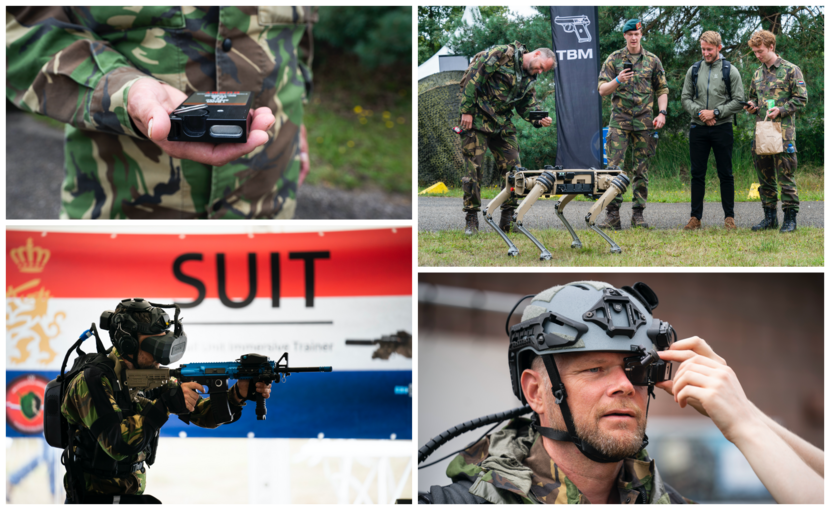 Nieuwigheidjes op de OVG-dag: Een rechthoekige handgranaat van Rheinmetall, de ‘aaibare’ V60 van Ghost Robotics, de SUIT (Small Unit Immersive Trainer) van Re-Lion is niet meer weg te denken bij OVG en tot slot de B20, die augmented reality toevoegt aan de Smarthelm.
