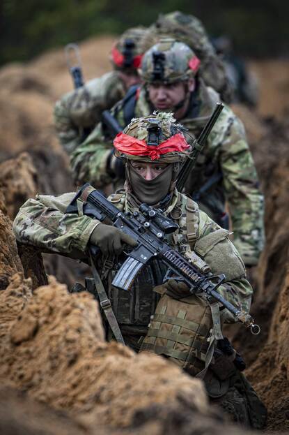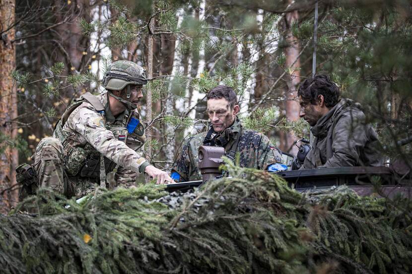 Vanuit een CV90 stuurt majoor Rutger de Nederlandse eenheid in het veld aan. “Het is mijn taak ervoor te zorgen dat compagnieën gezamenlijk vechten, dat de linie gesloten blijft en er geen gaten vallen. Ik analyseer de manoeuvres van de vijand en adviseer de Duitse commandant van de battlegroup.” Waarom deze certificeringsoefening belangrijk is? “Samen met de Duitsers, Noren en Tsjechen trainen we tijdens Iron Wolf onze skills en drills en laten we zien dat we op bataljonsniveau kunnen samenwerken als het erop aankomt”, legt de majoor uit. “Intussen zorgen we met onze aanwezigheid voor afschrikking, dragen we bij aan de veiligheid hier in de Baltische staten en Polen.”