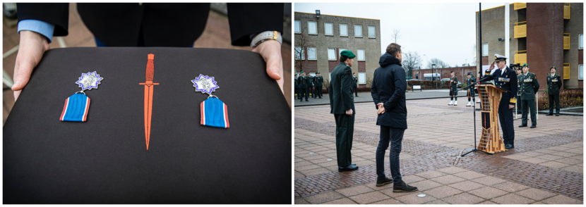 Ze kregen het ereteken op hun kazerne in Roosendaal uit handen van Plaatsvervangend Commandant der Strijdkrachten viceadmiraal Boudewijn Boots. “Het overviel mij een beetje. Zes jaar na dato. Maar het is een mooi gebaar”, aldus Peter. Michiel vult aan: “Het voelt ook dubbel. De aanleiding is ontzettend naar, maar de onderscheiding heel eervol.”
