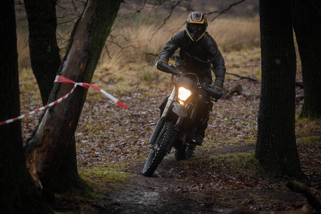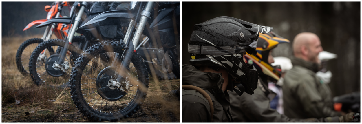 “Let op mannen! We beginnen vandaag met een paar rondjes inrijden op een single track. De ondergrond is hard, maar er zit een zachte bovenlaag op. Blijf gas geven, want anders gaat je motor glijden!”, instrueert Oldenziel zijn leerlingen. “We kijken hier goed naar het niveauverschil. De één is net omgeschoold op de nieuwe motor, de ander rijdt zelf ieder weekend offroad. Die eersten hebben wat meer individuele aandacht nodig en dat is prima!”, vertelt hij terwijl de eerste motoren er snerpend vandoor gaan.