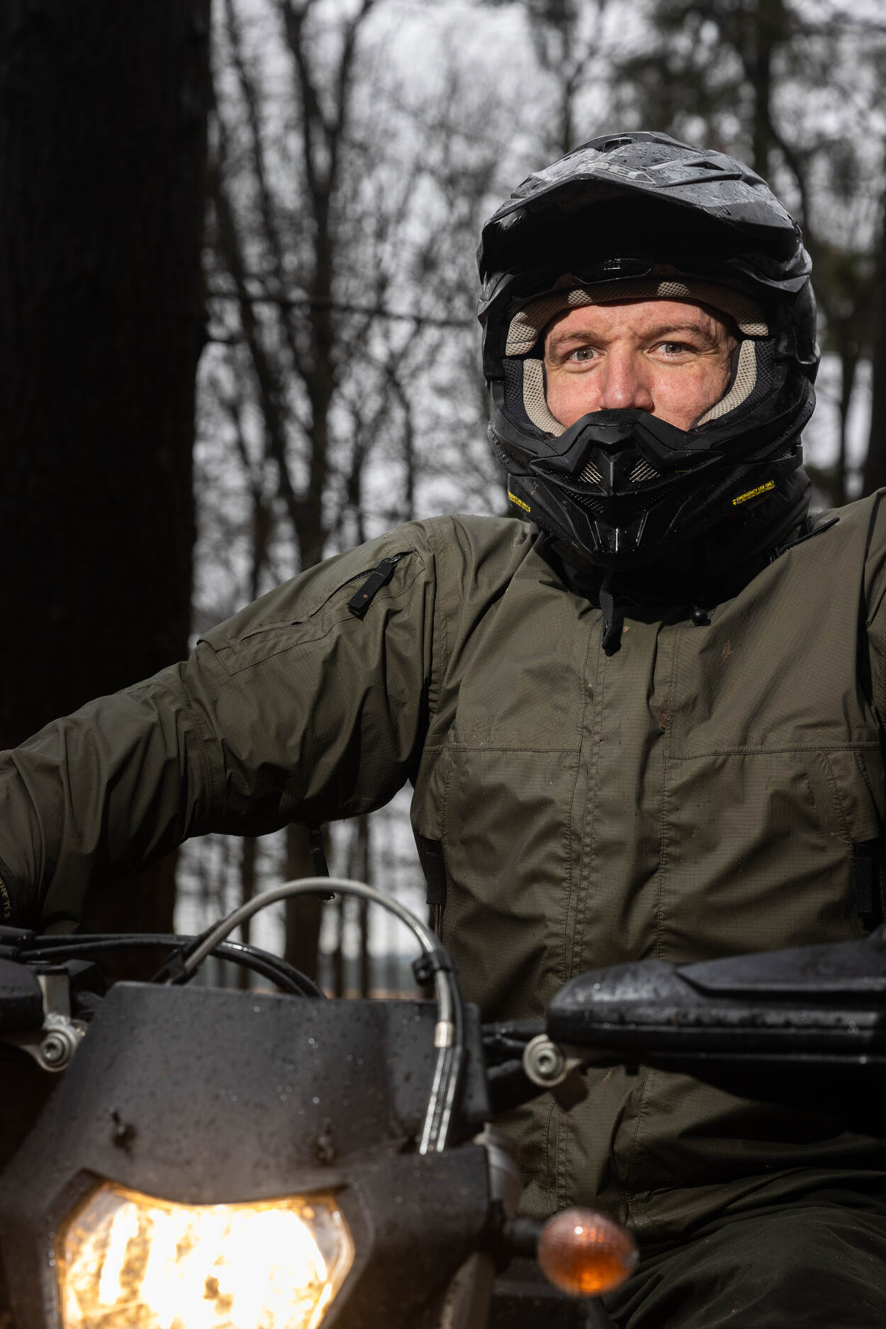 De groep verplaatst zich naar de glooiende rand van het Kreelsche Zand, een stukje bos naast de heide. Daar manoeuvreren de rijders tussen bomen en over boomstammen. “Waar de infanterie loopt moeten wij kunnen rijden”, vervolgt overste Hageman. “Hier gaat het niet om snelheid, maar om behendigheid en techniek. Zeker in dit weer kan een natte tak er al voor zorgen dat je neergaat. Daarom ben je constant bezig met vooruitkijken naar de beste route. Dat is driekwart van het werk.” Na een eerste ronde richt hij zich tot de cursisten: “De basishouding is zoveel mogelijk staan, ellebogen uit elkaar, tractie houden en het achterwiel sturen met je gewicht. Als de motor nu gekke dingen doet kun je reageren.”