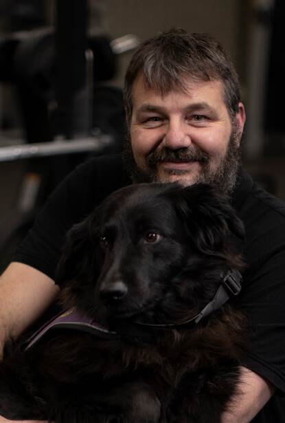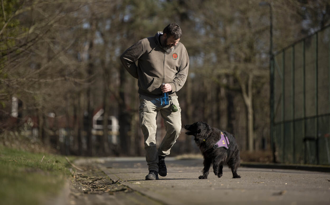 “Nee, daarna ging het echt een tijd niet meer en kreeg de PTSS veel vat op me. Mijn leven veranderde pas weer in positieve zin toen ik Winke in 2014 kreeg. Ineens kon ik me niet meer verstoppen, want zij moest vier keer per dag naar buiten, en ook gewoon slapen ‘s nachts. Dankzij haar kreeg ik mijn dag- en nachtritme weer terug, ging ik stapjes maken. Sterker nog, ik bouwde zelfs mijn medicatie af. Ik mocht toch mijn emotie wel voelen, af en toe huilen of boos zijn? Ik hoefde toch niet afgestompt op de bank te zitten? Als ik maar niet zo boos werd dat ik de boel ging slopen. Twee jaar later kwam ik een oud-collega tegen, mijn huidige vriendin (Zegel is gescheiden van zijn eerste vrouw, red.). Karin accepteerde me zoals ik was, inclusief PTSS. Maar wat ze niet pikte, was dat ik de PlayStation grijs speelde. Zij spoorde me aan om van die bank af te komen.”