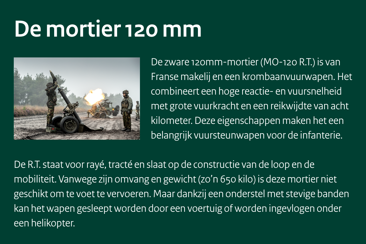 “Recente conflicten, zoals in Oost-Oekraïne in 2014 en nu wéér in de oorlog met Rusland, hebben de kwetsbaarheid van die satellietcommunicatie aangetoond”, weet Mastenbroek. “Het is voor een tegenstander mogelijk om een compleet gebied van GPS-signalen te ontzeggen. Alle systemen die daarvan afhankelijk zijn, worden dan onbruikbaar, zonder back-up. Weten waar je bent en wat er om je heen speelt, situational awareness, is essentieel in het gevecht. Je kunt dus niet afhankelijk zijn van GPS. Als onze 120mm-mortieren moeten worden ingezet, is dat essentieel voor de veiligheid van de eigen troepen. Dus hier geldt ook: hoe sneller je kunt vuren, hoe beter. Dat redt levens van onze mensen. Het is dus een win-winsituatie, als dit goed werkt.”