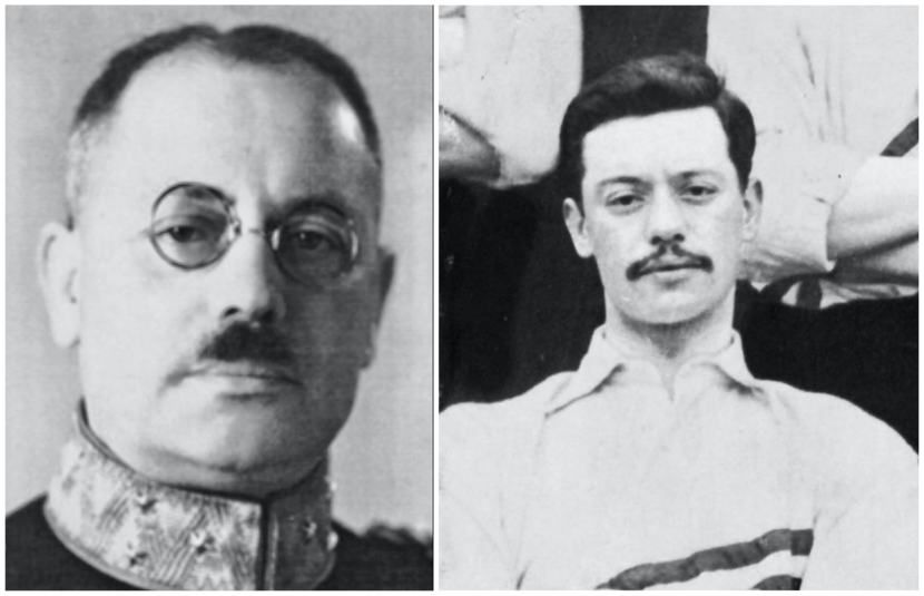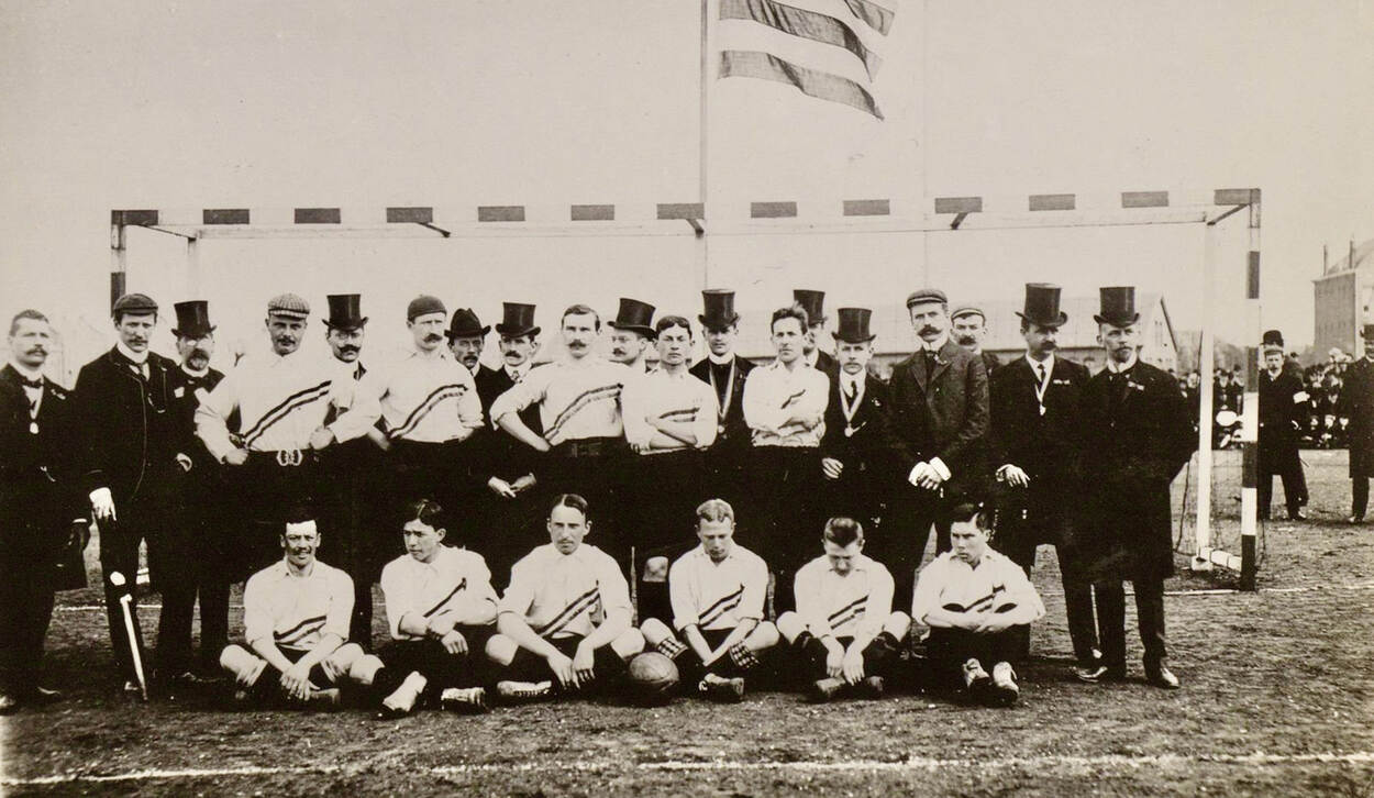 Grote foto boven: Het Nederlands elftal in 1905, met links zittend de dan jonge officier Rein Boomsma.