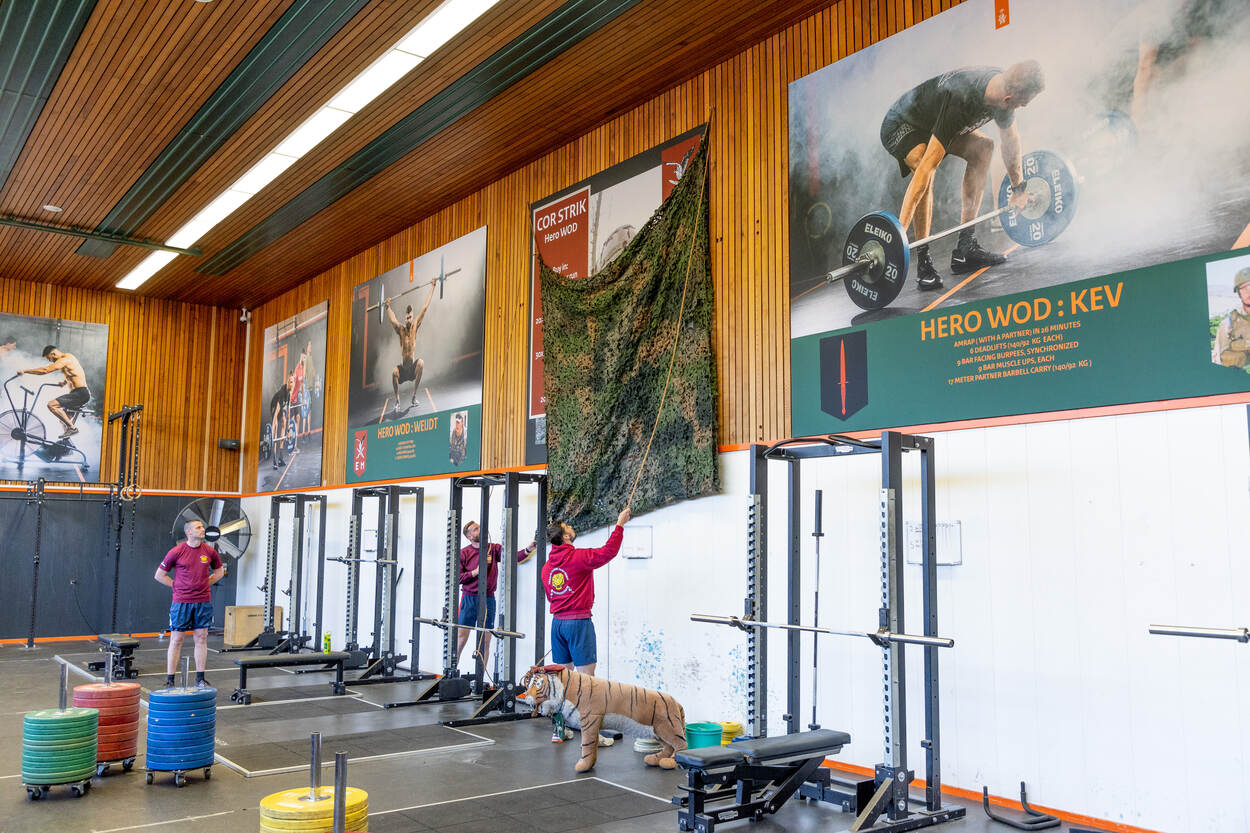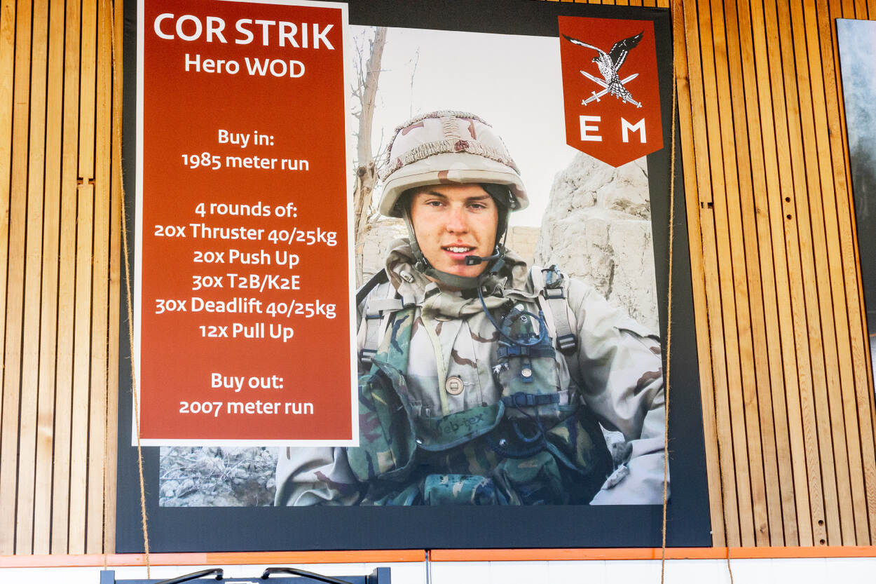 “Met een aantal tijgers hebben wij de ‘Cor Strik Hero WOD’ ontwikkeld”, zegt compagnies-sergeant-majoor (CSM) Jan. “De banner in de crossfitbox, met de ‘Cor Strik Hero WOD’ erop is een passend eerbetoon”, vindt hij. Het initiatief kwam van jager-1 Rick en sportinstructeur sergeant Quint. “Het idee is ontstaan tijdens onze uitzending naar Curaçao”, vertelt Quint. “We hebben geprobeerd zoveel mogelijk verwijzingen naar Cor in de Hero WOD te verwerken. “De workout is behoorlijk pittig en echt bedoeld om één keer per jaar uit te voeren.”