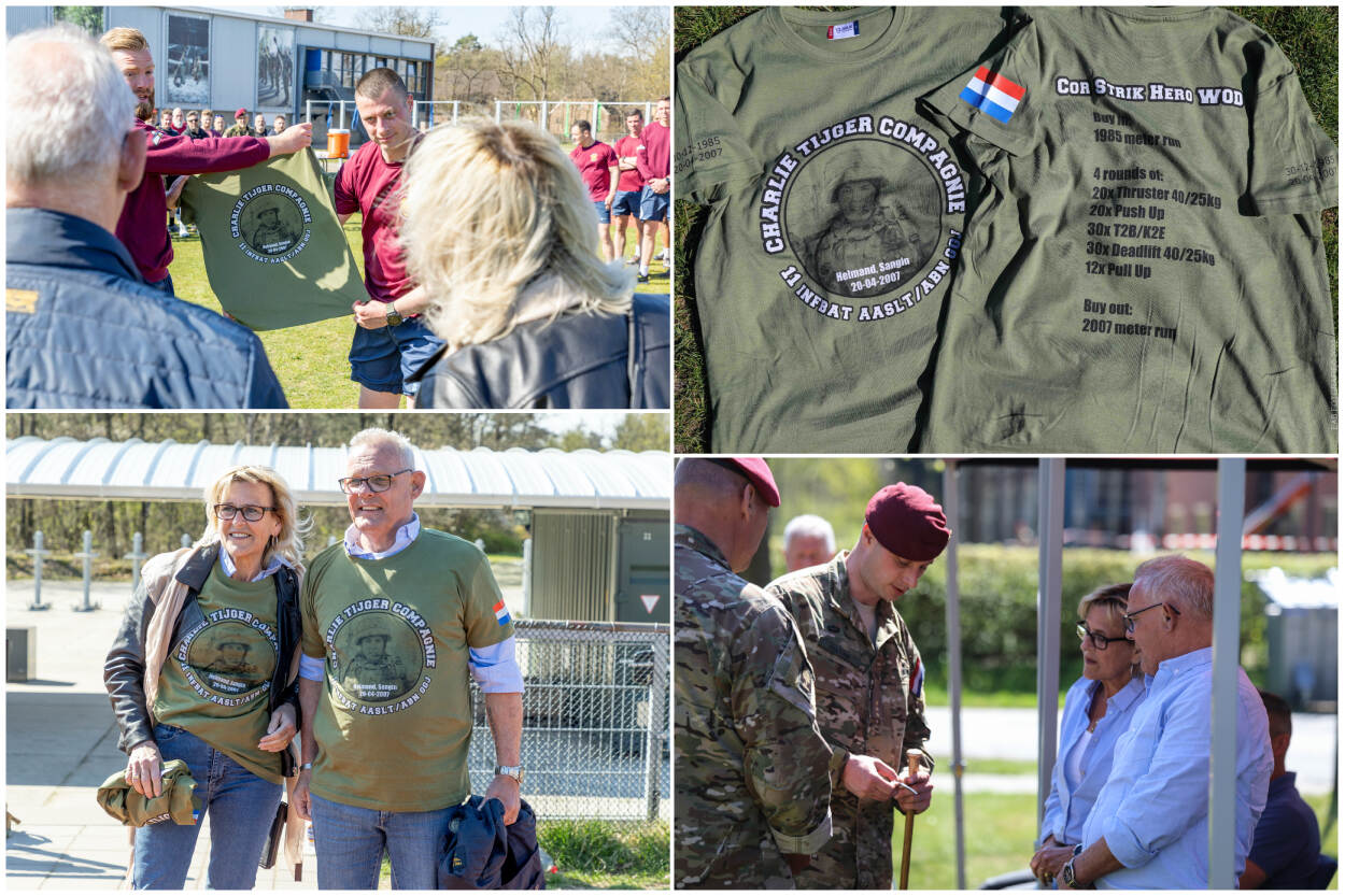 ‘The eye of the tiger’ klinkt keihard uit de geluidsboxen op Groot Heidekamp, het sportterrein op de Oranjekazerne in Schaarsbergen. De Charlie Tijgercompagnie 11 Infanteriebataljon Luchtmobiel, Garde Grenadiers en Jagers, is in z’n geheel aangetreden in sportkleding. Voor een bijzondere Hero workout of the day (Hero WOD): het eerbetoon aan korporaal Cor Strik én de Amerikaanse sergeant Alexander van Aalten.