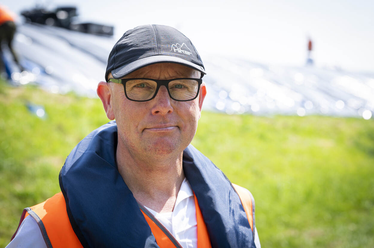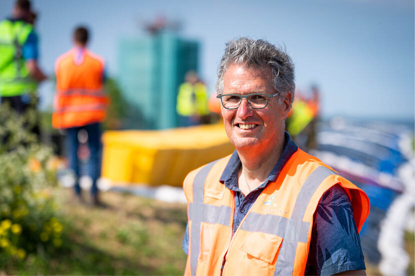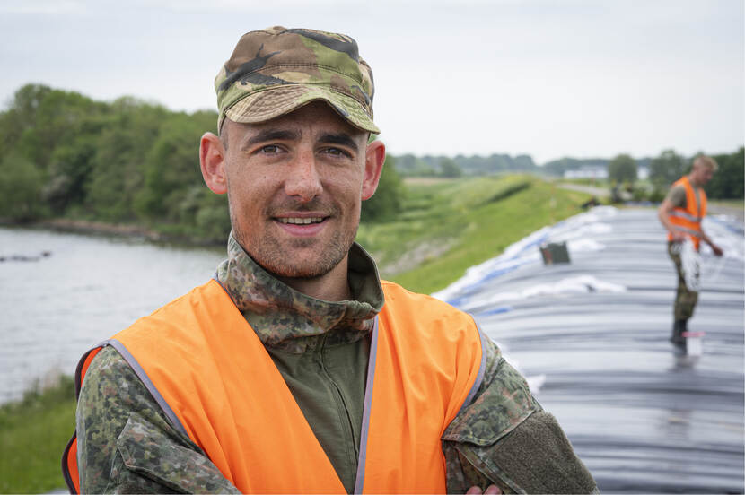 Op de dijk vuurt eerste-luitenant Van der Peijl, pelotonscommandant Advanced Constructieteam van 103 Constructiepeloton, de troepen onophoudelijk aan. “Vanwege de klimaatverandering is het een goede zaak om dit te trainen”, vertelt hij. “Als de nood aan de man komt moeten wij dit kunnen. Nu is het mooi weer, over bijvoorbeeld een maand kan het mis zijn. In de voorbereiding is het belangrijk om na te gaan wie het materiaal aanlevert: wij of onze civiele partner? Hoe meer je dingen weet van de andere partij, hoe beter. Die werkt nu eenmaal anders dan wij. Er staat hier een tevreden man. We oefenen in iets waarmee we de bevolking kunnen helpen als het erop aankomt. Dankbaar werk.”
