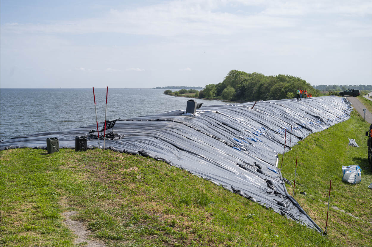 In de afgelopen uren hebben de bewoners van de Prinses Margrietkazerne in Wezep de dijk ‘ingepakt’ met grijze dijkzeilen die stevig zijn vastgepind. Daarover worden witte lijnen gespannen om zo de boel nog vaster te krijgen. Als de woeste golven zich op de dijk storten spoelen er dankzij deze techniek geen dijkdelen naar beneden, het achterland in. Overal en vooral op de randen van de zeilen komen zandzakken te liggen. Dat maakt de boel nog steviger. “Hee, let op. Die zakken daar moeten hoger komen. Er mag geen water onder het zeil komen. En span dáár nog even een touw.”