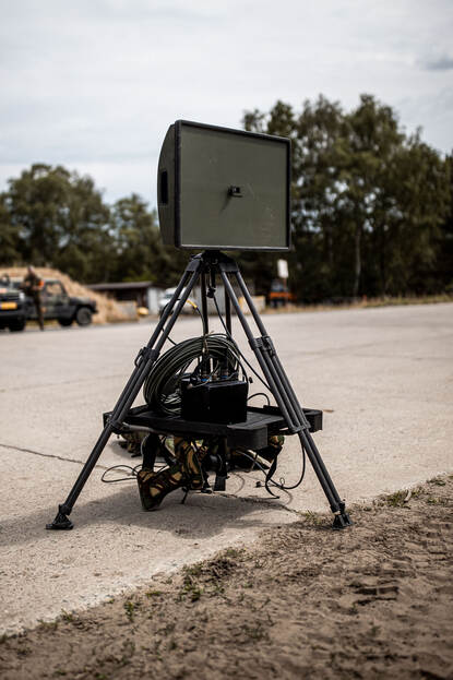 Dan is het goed om door de bomen het bos te blijven zien en die middelen goed in te zetten. “We hebben regelmatig spec-weken, waarin je de kans krijgt je verder te specialiseren”, weet wachtmeester Patrick, die met ‘zijn’ Squire Ground Surveillance Radar de Sky Ranger probeert te volgen. Sinds het begin van deze eeuw is deze radar in gebruik bij 43BVE, maar sinds twee jaar terug bij de eenheid na een update. De radar kan nu kantelen en is daarmee helemaal klaar voor nieuwe gevaren uit de lucht, zoals ‘drones’. “We kunnen hiermee op zo’n veertig kilometer grote voertuigen in beweging herkennen. Dat gebeurt op kenmerken automatisch en daarin zit een kleine foutmarge. We hebben al eens een tank uit de lucht zien buitelen”, bekent hij lachend.