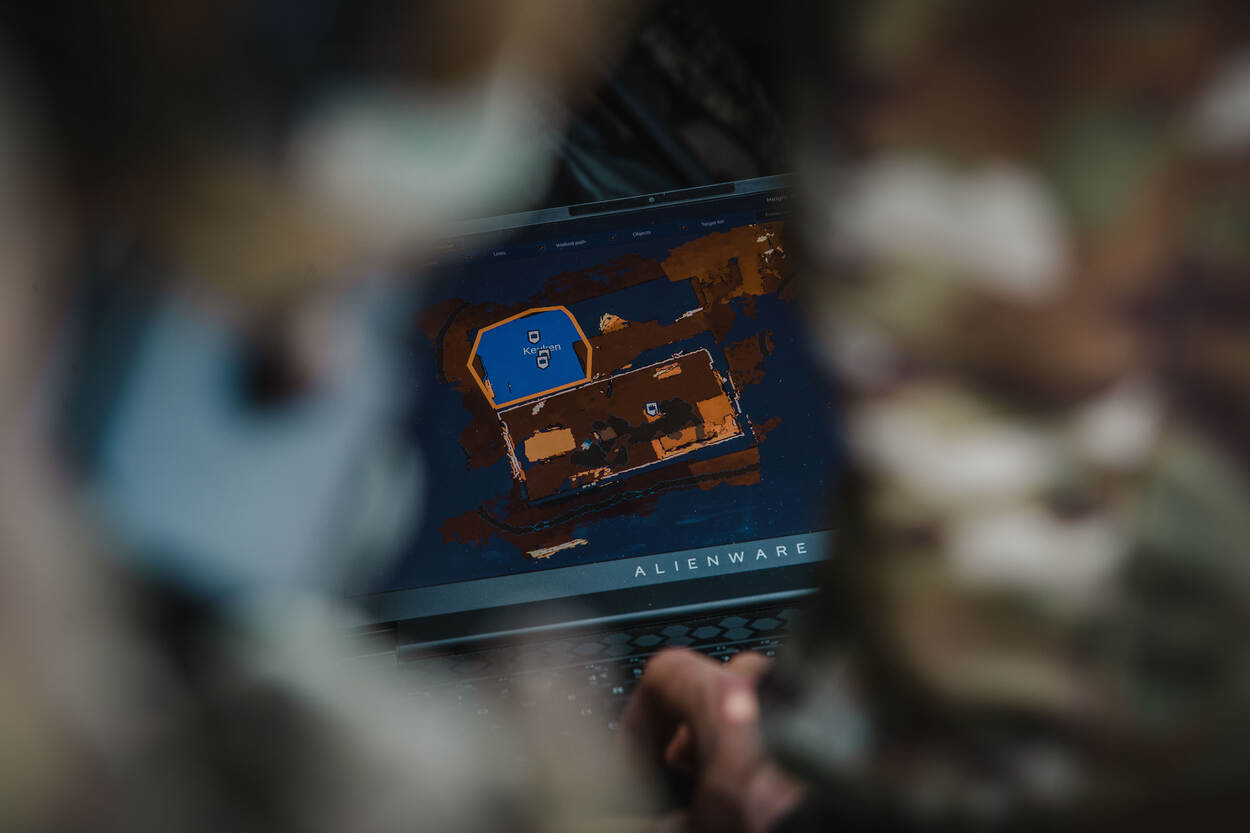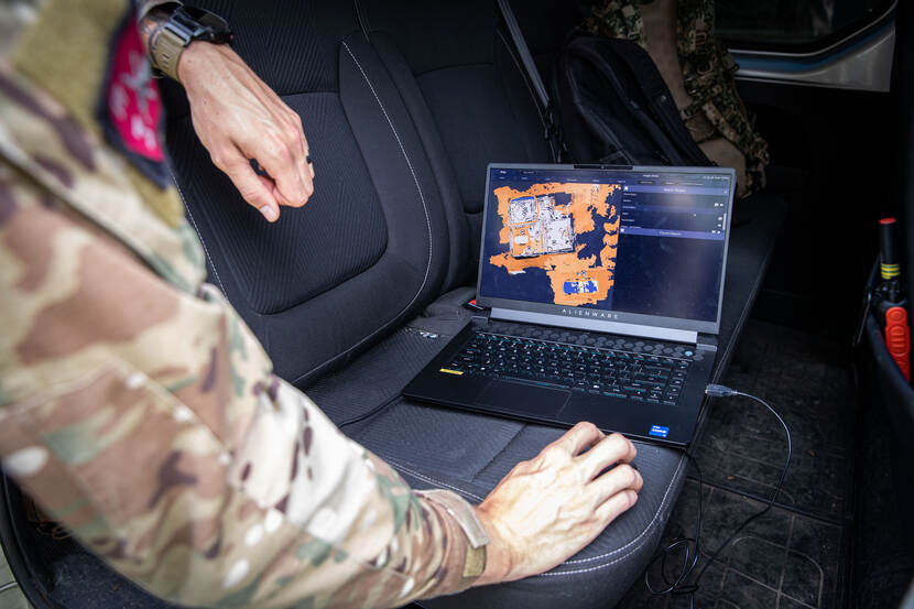 Lopend rond het gebouw legt korporaal Robbert van het AST met de hololens de infrastructuur vast. Op het laptopscherm ziet hij vervolgens het resultaat, alsook zijn collega’s die de ruimtes binnen searchen. “We zijn nu vooral aan het kijken hoe de bril ons kan ondersteunen. Voor nu merk ik dat je meer overzicht hebt tijdens het gehele scenario. Geen flipover, maar een 3D-maquette waarop je ziet waar iedereen is. Samen met de communicatiemiddelen en de database, voor identificatie van bijvoorbeeld munitiesoorten, biedt ARTEX zeker mogelijkheden. Na de operatie helpt het systeem je om rapportages vollediger en beter te maken.”