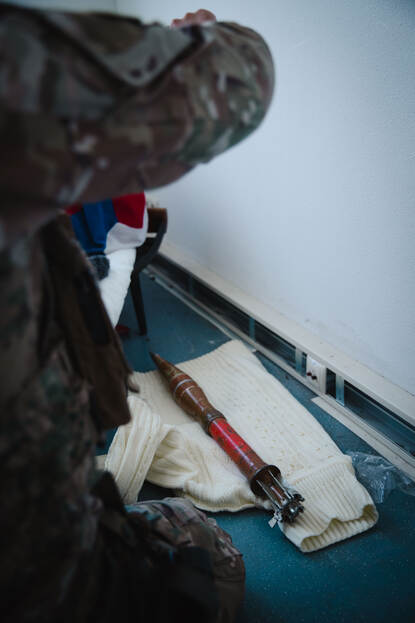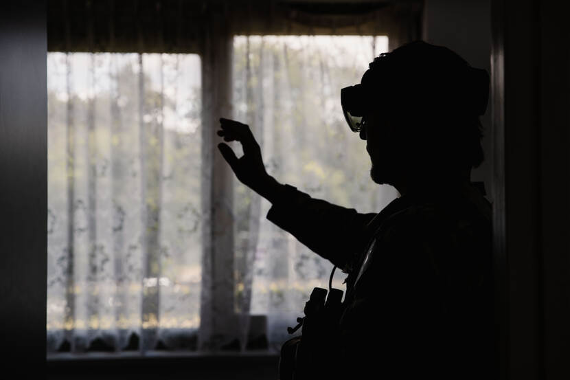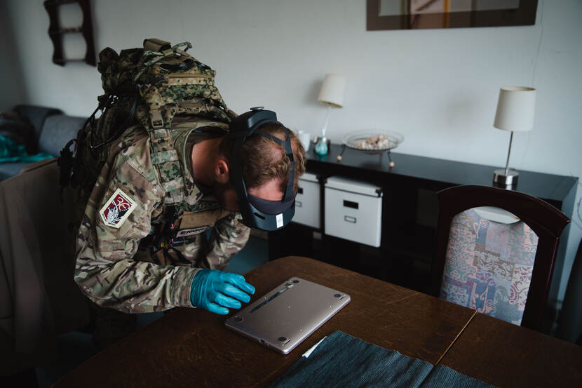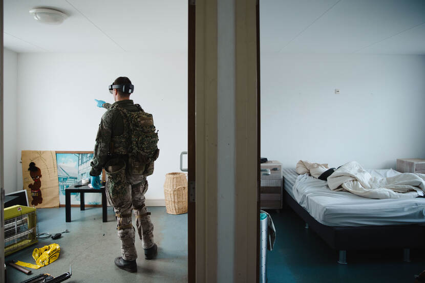 Het lijkt een doodnormale woning, maar gebouw 31 bij de Mineurs- en Sappeursschool in Reek ligt vol explosieven, geld en gegevensdragers. Des te gekker is dat te midden van de plaats van de operatie een genist met een AR-bril op staat. Voor wie niet beter weet, reikt hij met zijn vingers in het luchtledige; in zijn virtuele omgeving legt hij echter de bewijslast van zijn zoeking digitaal vast.