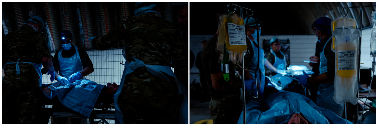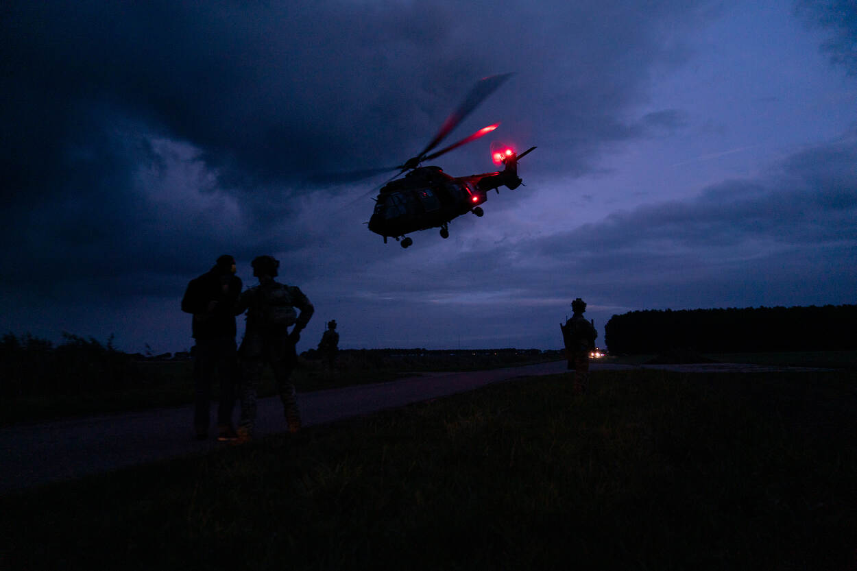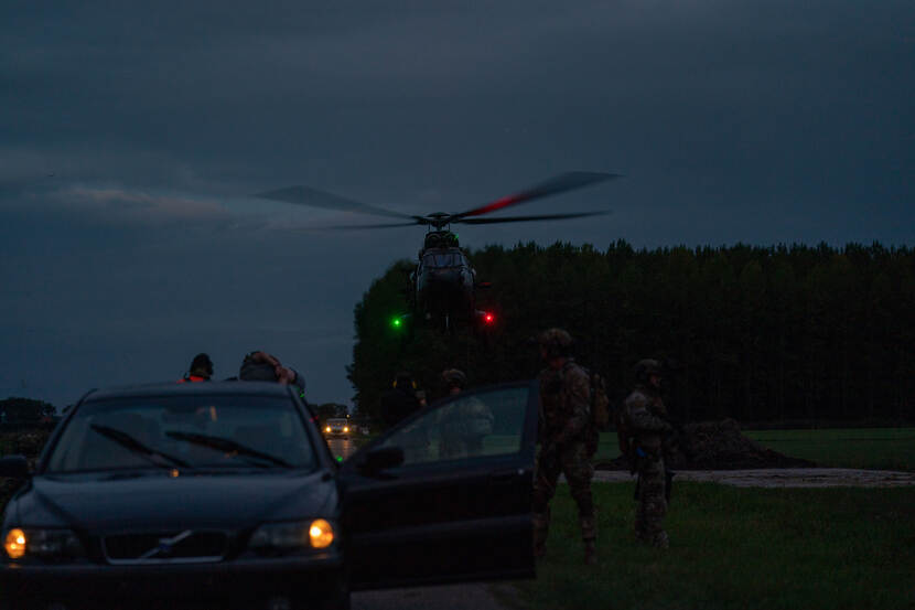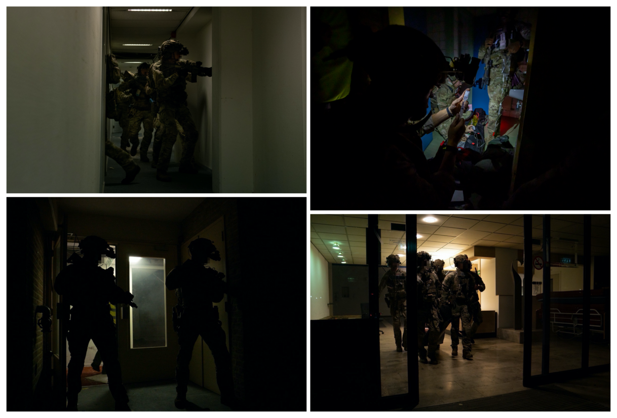 Militairen van 30 Natresbataljon zijn de slechteriken, die diplomate Ana bewaken. “Iedereen wil zo’n actie als deze meemaken”, weet soldaat-1 Gerard, die samen met soldaat-1 Jeroen het serieuze spel meespeelt. Hun rol is echter snel uitgespeeld als de operators door de gangen snellen en de gijzelaar weten te ontzetten, te stabiliseren en veilig naar de helikopter weten te transporteren naar Vliegbasis Gilze-Rijen. De zes specialisten van het SOST staat daar al klaar om de gewonden te ontvangen. “Ook daar testen we veel spullen en die ervaringen delen we breed. Het is immers het doel om onze militairen de grootst mogelijk veiligheid en beste zorg te leveren.” Dat, vindt kapitein Sander, maakt SOF-support in alle facetten zo belangrijk. “Samen oefenen, zoals nu, is essentieel om te zijn voorbereid op wat er ook komen gaat.”