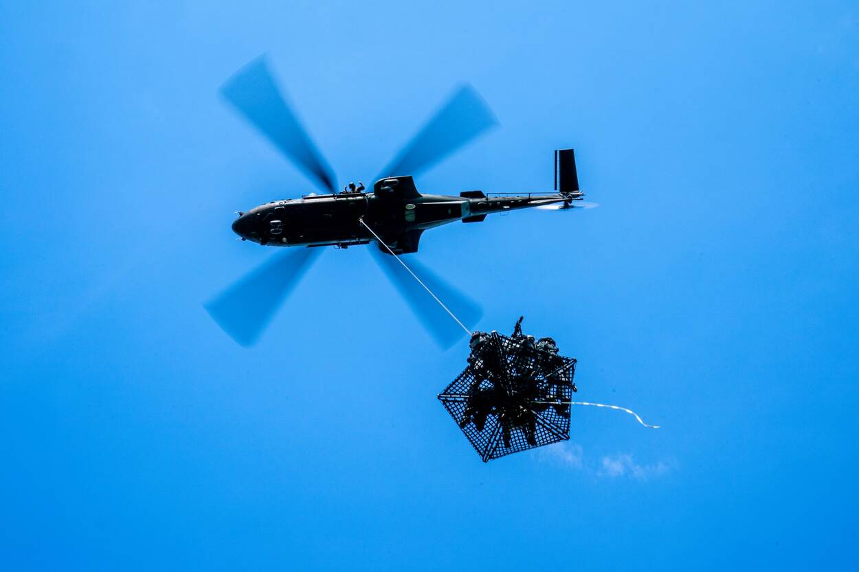 AirTEP staat voor Airborne Tactical Extraction Platform. Hangend onder een heli kun je er tien operators op lastig bereikbare of kritieke locaties droppen of mee oppikken. Dat laatste werkt als volgt. Op de plaats van bestemming duwt de loadmaster het ongeveer 55 kilo zware apparaat uit de stil hangende helikopter. Vervolgens laat hij het ding met de katrol aan boord in de buurt van de mensen op de grond zakken. Met het ontkoppelmechaniek klapt hij de AirTEP open en nemen de passagiers plaats. “Het enige wat de loadmaster nu nog moet doen, is het koord aan de AirTEP van de katrol halen”, aldus Van Rens, die werkzaam is bij het Defensie Expertise Centrum 3D (DEC-3D) in Schaarsbergen. “Het platform hangt dan alleen aan de haak onder de heli. Een secundaire borging zorgt ervoor dat ‘ie niet kan losschieten.”